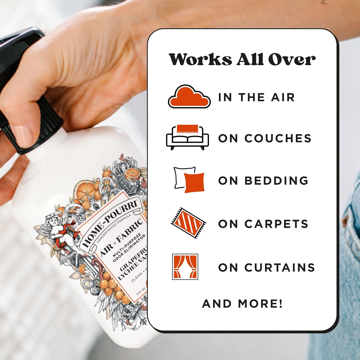 - WORKS ON: AIR, CURTAINS, CARPETS & RUGS, COUCHES & BEDDING, TRASH CANS and more! Made by the makers of Poo~Pourri, so you know it works!