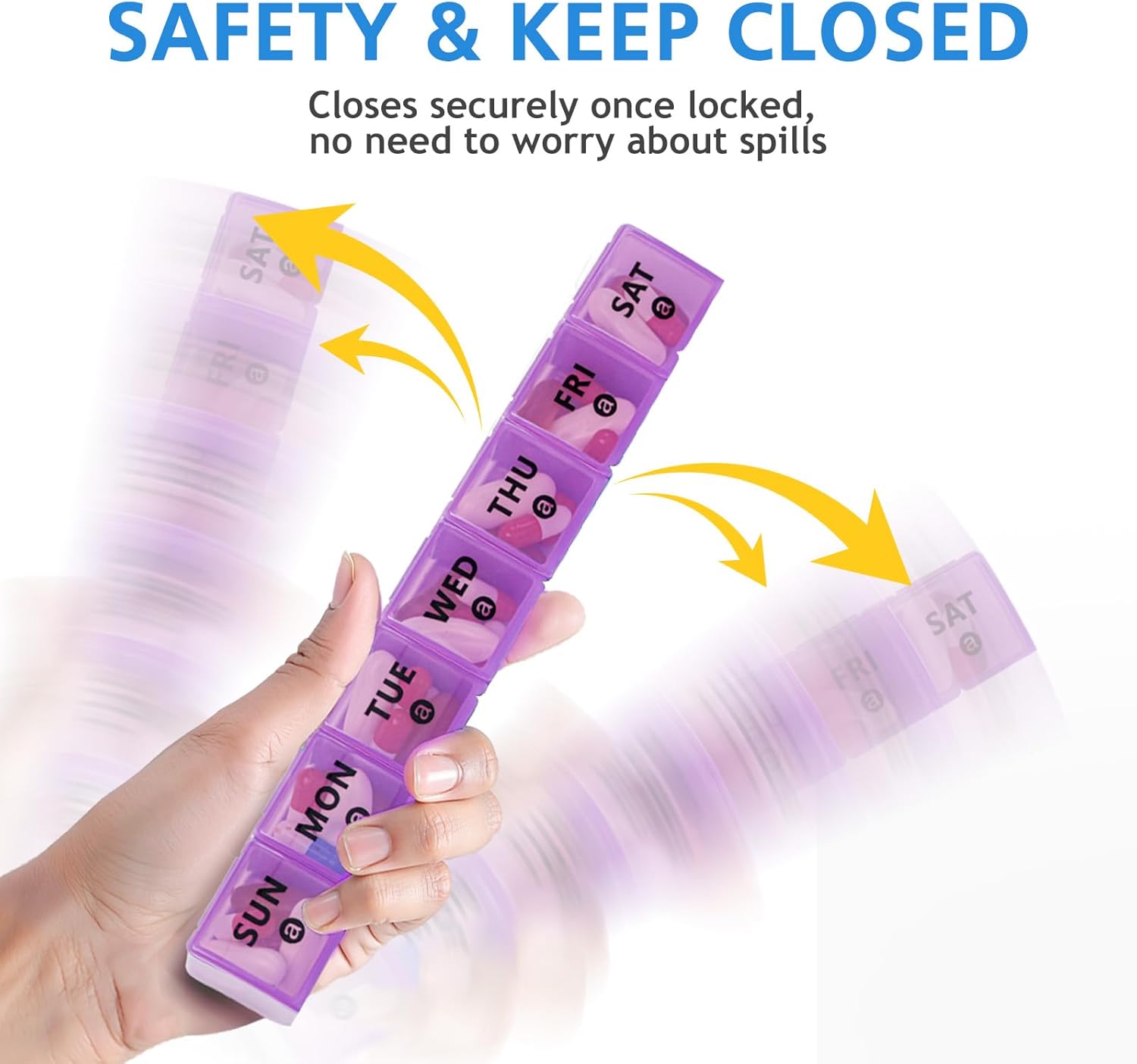 - EASY-TO-READ & DURABLE PRINTING: This 7 day pill organizer features bold, high-quality day markings that remain clear and legible even after long-term use. The upgraded printing resists fading and rubbing off, making it easy to track your pills every day without worrying about wear or peeling.