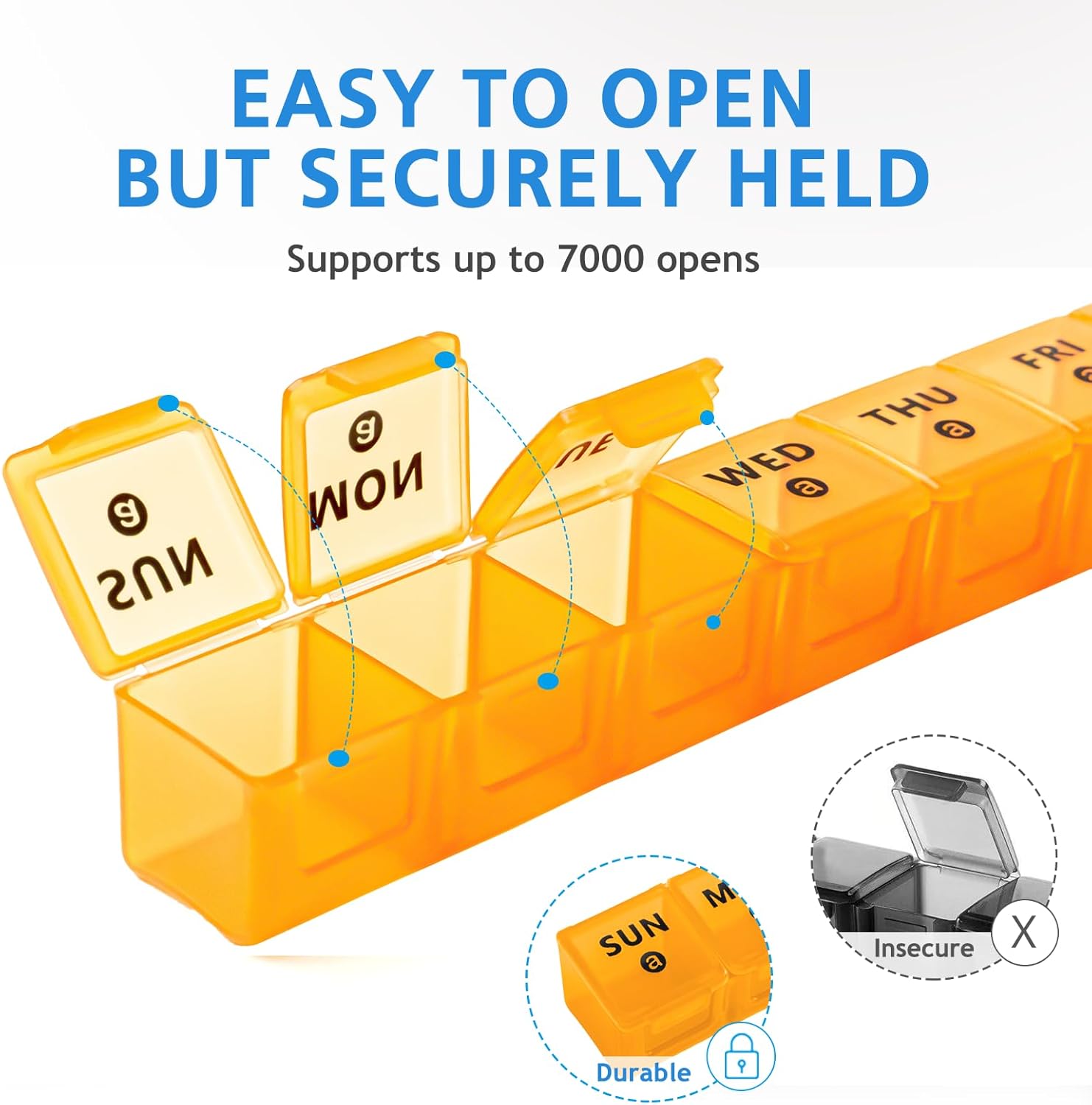 - EASY-TO-READ & DURABLE PRINTING: This 7 day pill organizer features bold, high-quality day markings that remain clear and legible even after long-term use. The upgraded printing resists fading and rubbing off, making it easy to track your pills every day without worrying about wear or peeling.