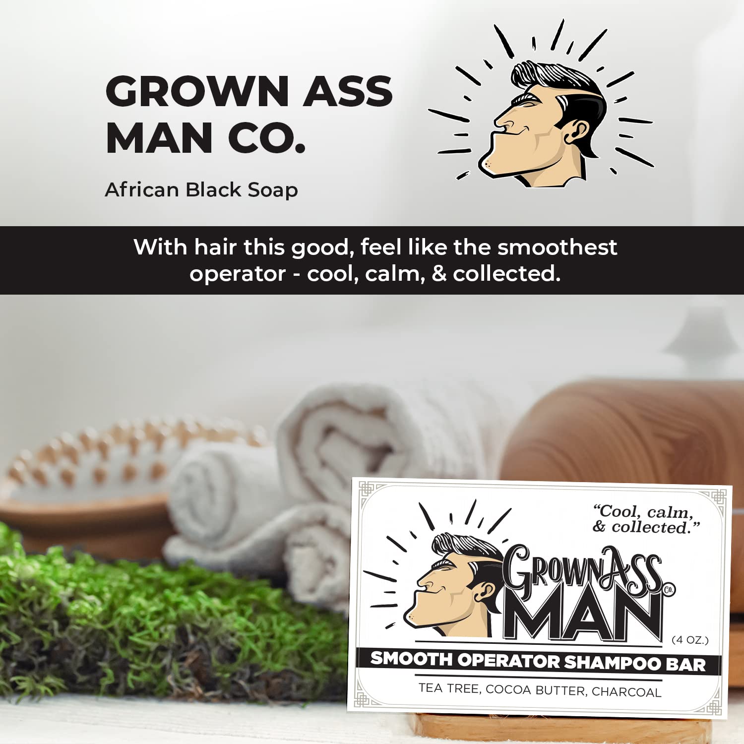 Grown Ass Man Co. - Solid Shampoo Bar Rich Lather 3 in 1: Hair, Beard & Body Wash - Plastic Free & Eco-Friendly, Natural & Organic Clean for All Hair Types, 4oz Bar (Smooth Operator, Single)