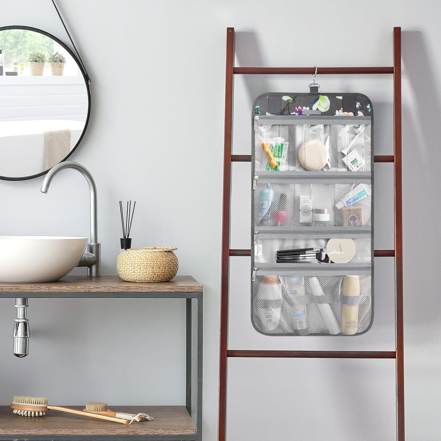 PAVILIA Hanging Toiletry Bag Women Men, Travel Kit Foldable Large Toiletries Organizer, Roll up Cosmetics Makeup Bag Accessories, Waterproof Essentials Jewelry Case (Floral Grey)