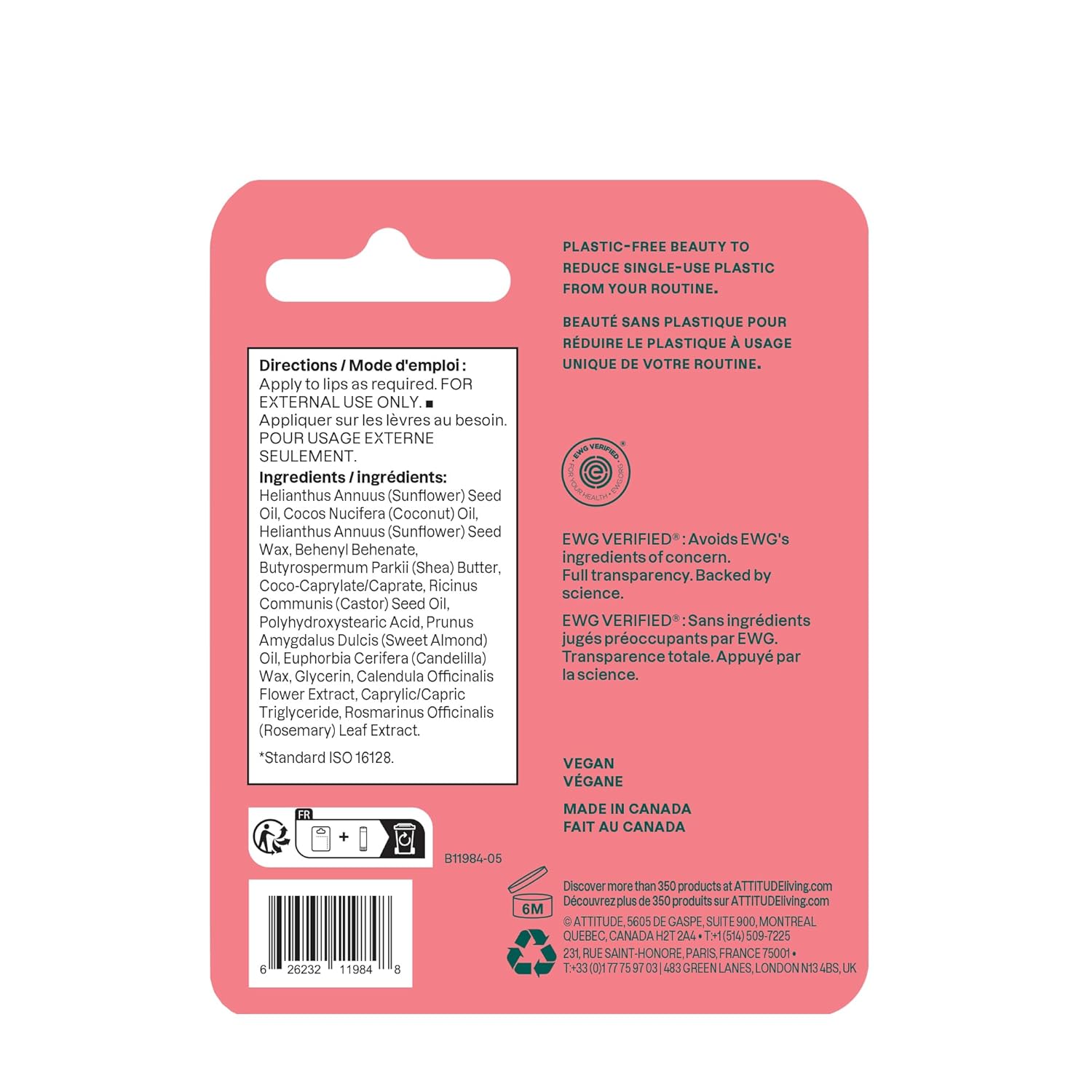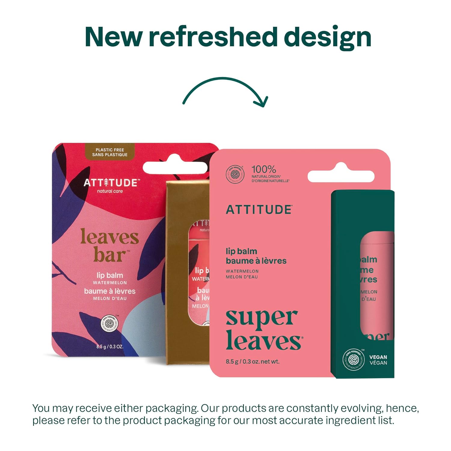 ATTITUDE Lip Balm, Natural Origin, Nourishes & Protects, Shea Butter, Coconut & Castor Oils, EWG Verified, For Dry Lips, Men and Women, Vegan, Watermelon, 0.3 Oz