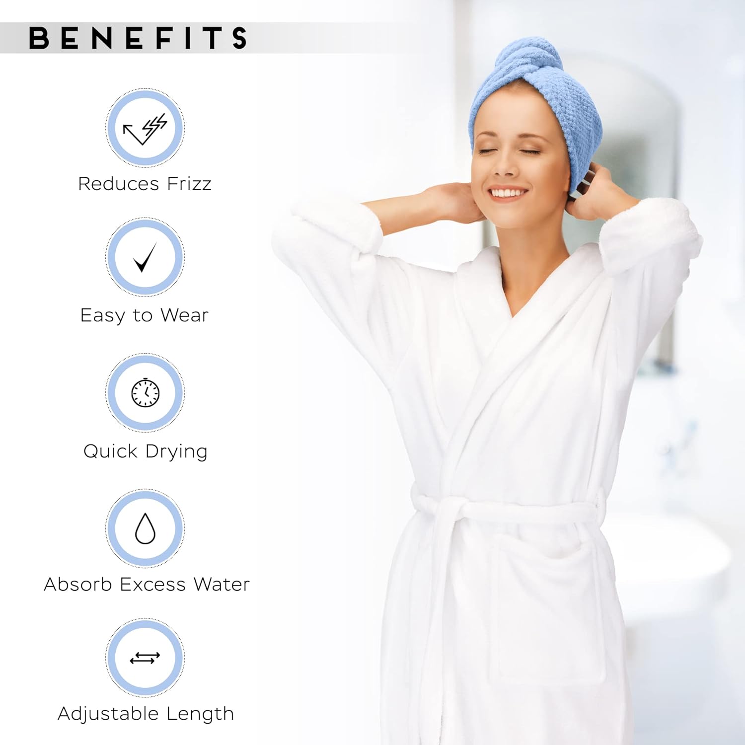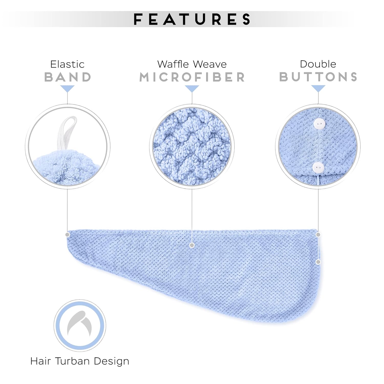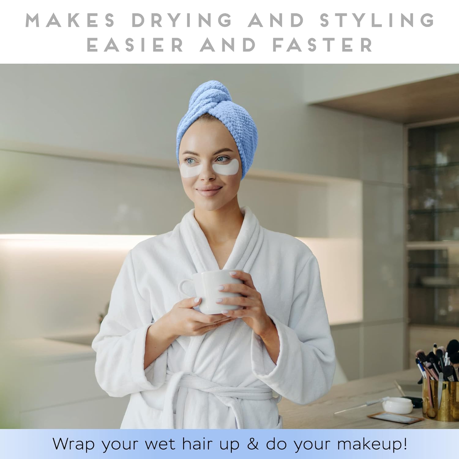- Makes drying and styling easier and faster. Wrap your wet hair up & Do your makeup!
