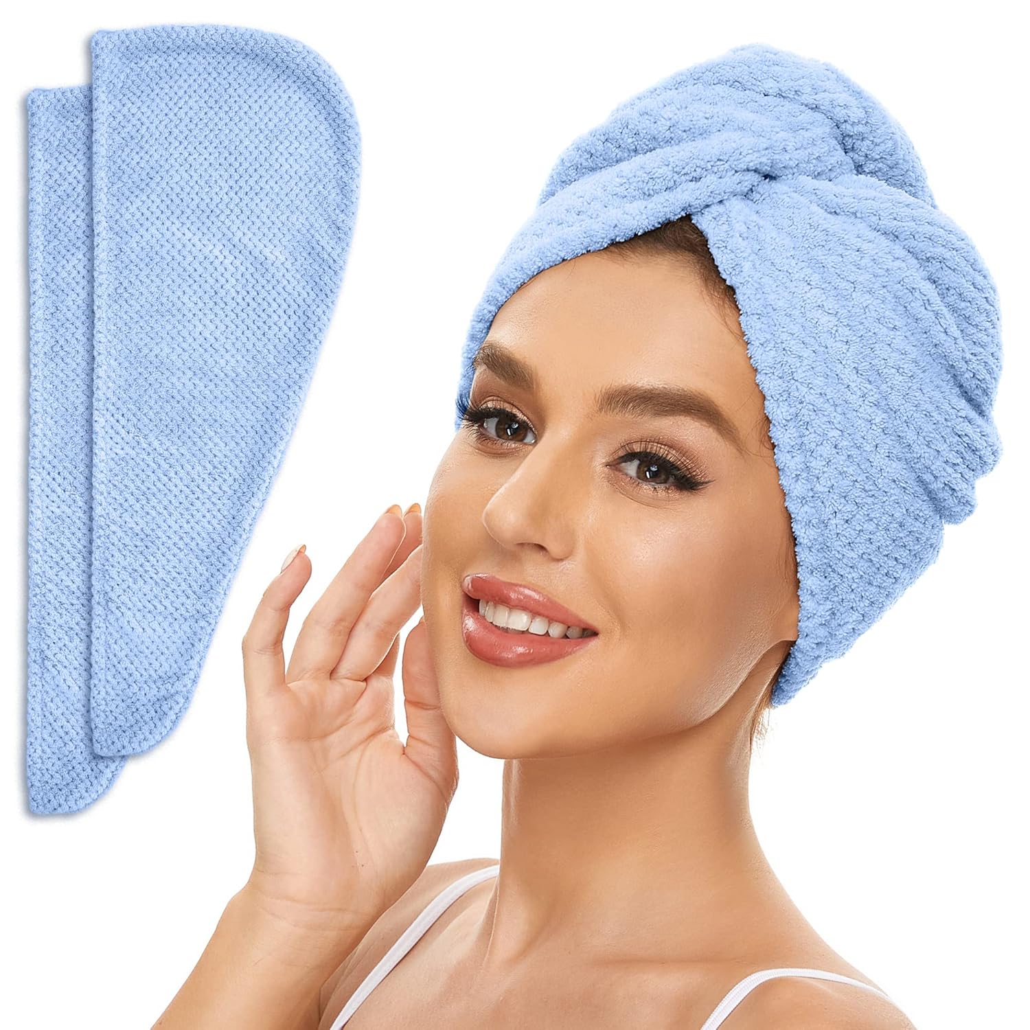2 Pack Microfiber Hair Towel Wrap for Women, Anti Frizz Quick Drying Hair Turban for All Hair Style, Absorbent and Lightweight (Blue)