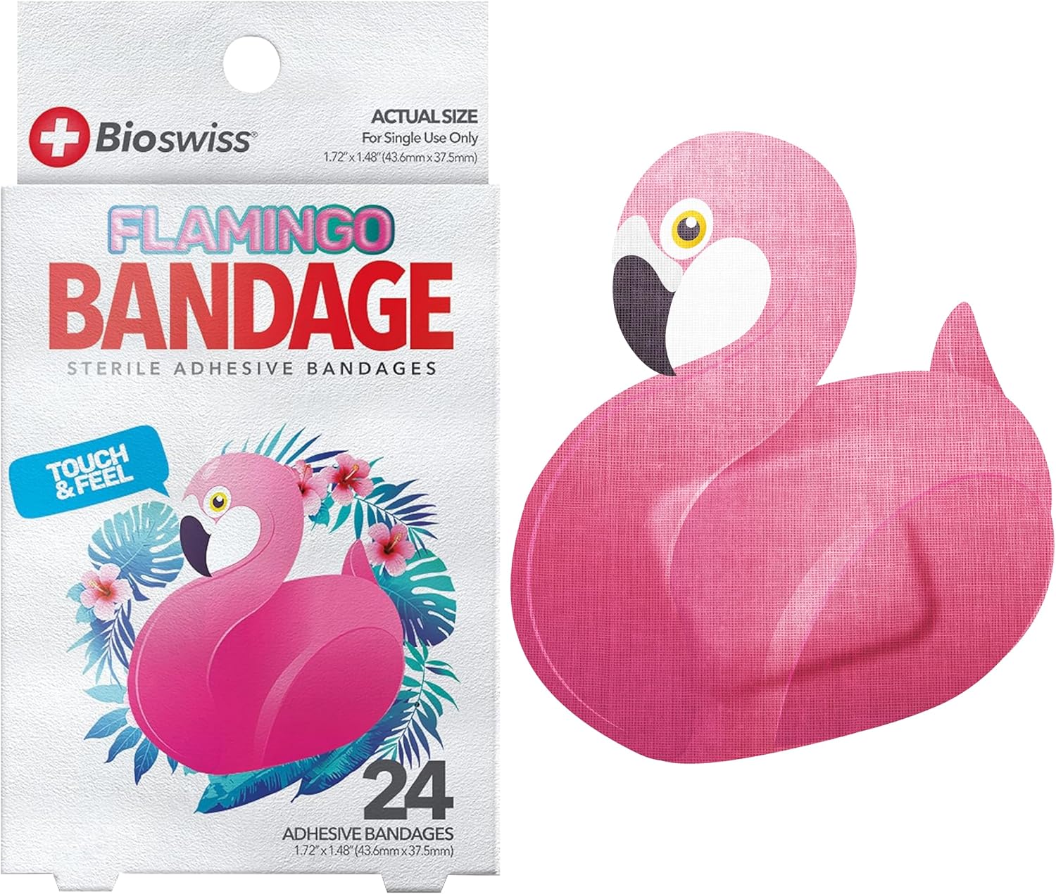 - 24 FLAMINGO KIDS BANDAGES: Fun flamingo-shaped adhesive bandages pack helps protect cuts, scrapes, and minor wounds while making healing less stressful for children