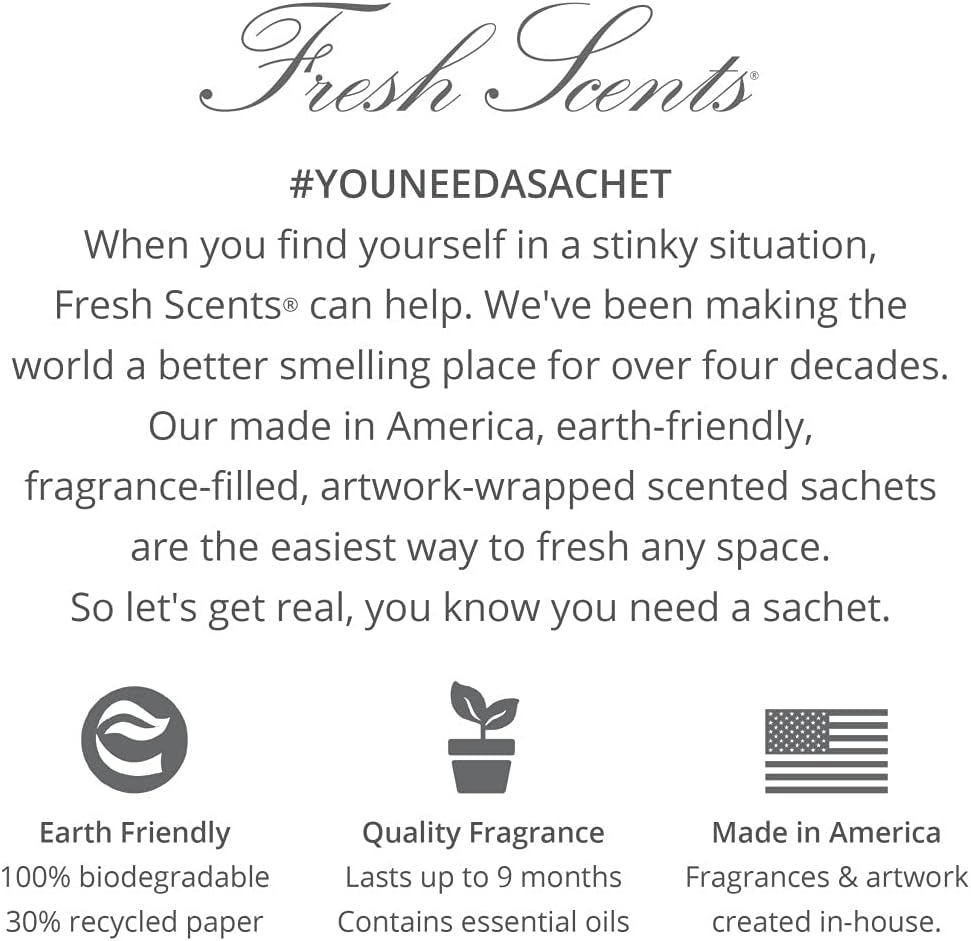 - FRESH SCENTS SACHETS, Set of 3. Made in the U.S.A. with biodegradable materials. Fresh Scents scented sachets are made of a non-toxic blend of naturally occurring materials and fragrance. The natural material used is extracted from the soil and is very porous to allow for maximum fragrance absorption. This allows our sachets to diffuse fragrance for up to 4 months.