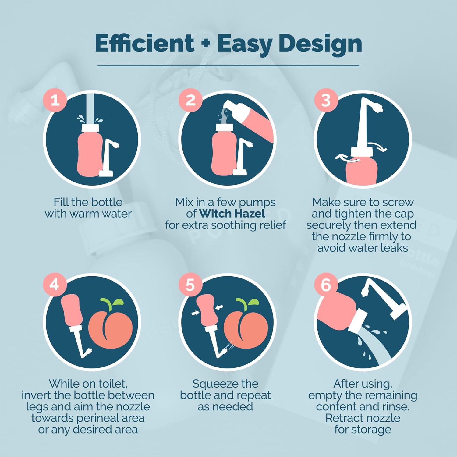 - UPSIDE DOWN DESIGN - The upside down peri bottle design and angled spout allow you to easily soothe your most sore, sensitive, and hard-to-reach areas that the hospital bottle can’t. Just fill with water, screw the top on, pull the spout all the way up and angle toward the desired area, then squat, spray, and soothe.