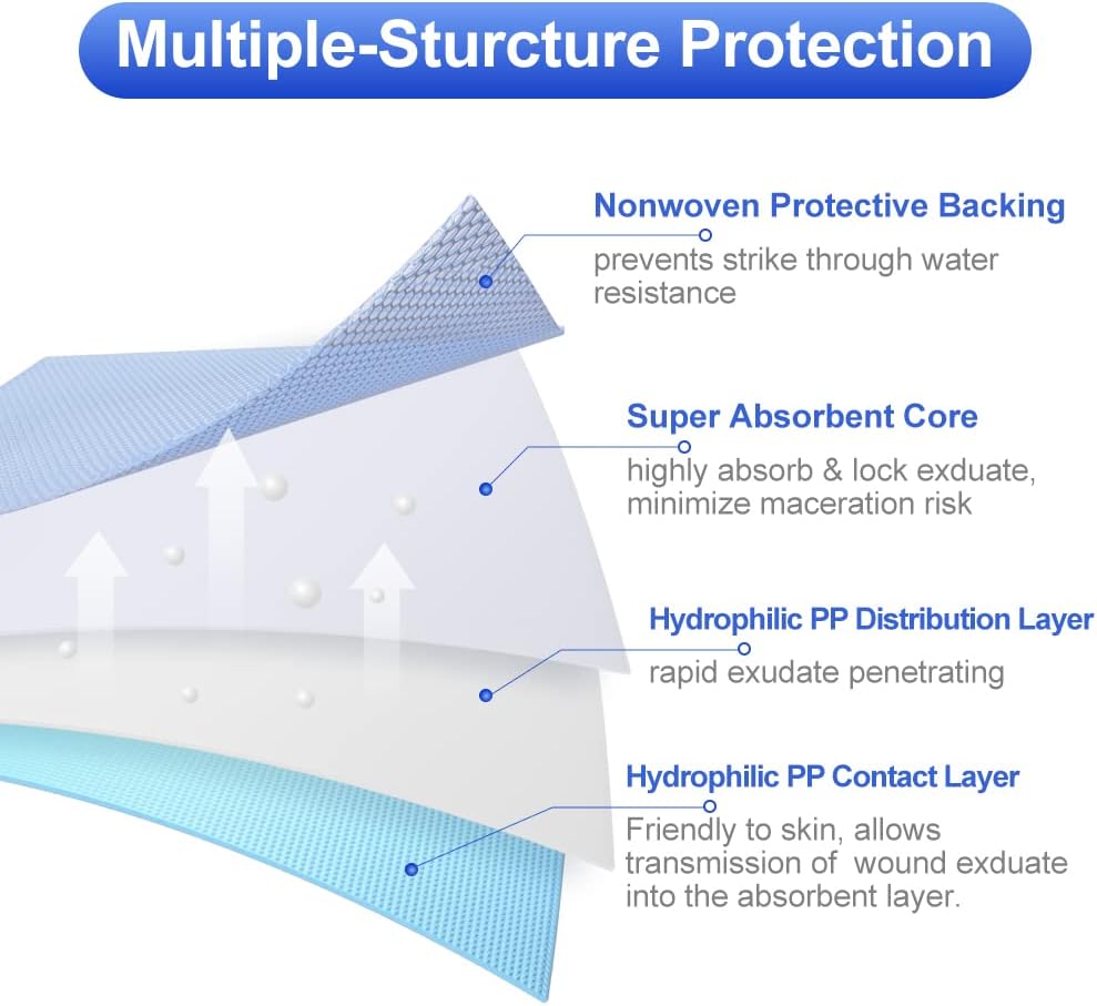 - HIGH ABSORPTION, FEWER CHANGES – The SAP polymer core locks in fluids and prevents maceration, reducing dressing change frequency compared to traditional gauze pads.