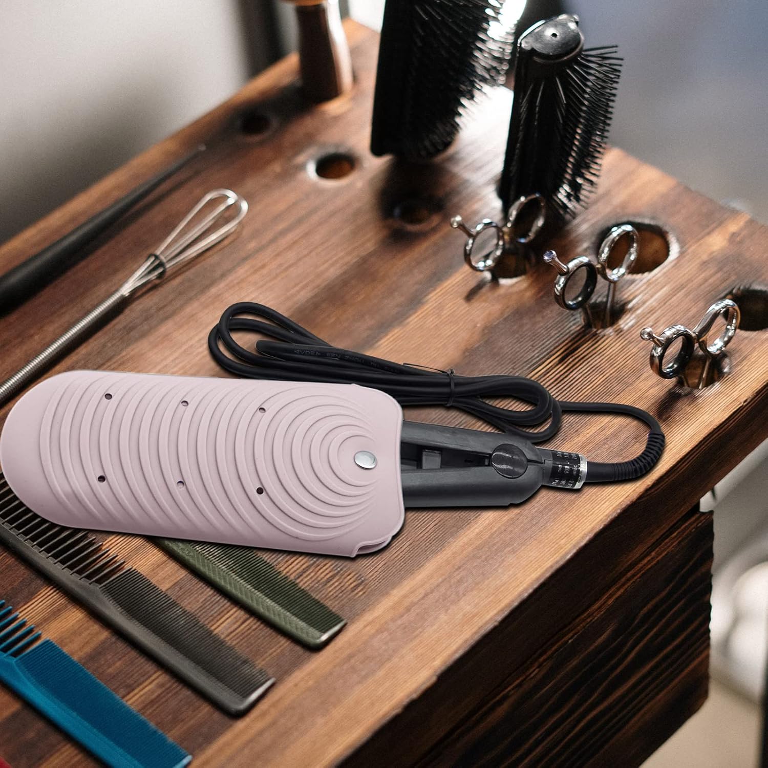 - 【Unique Design】Excellent non-slip waves texture effectively prevents hot hair styling tools slippery from table. Holes on mat pouch fast chill salon appliances. Front button fixes the tools unmovable.