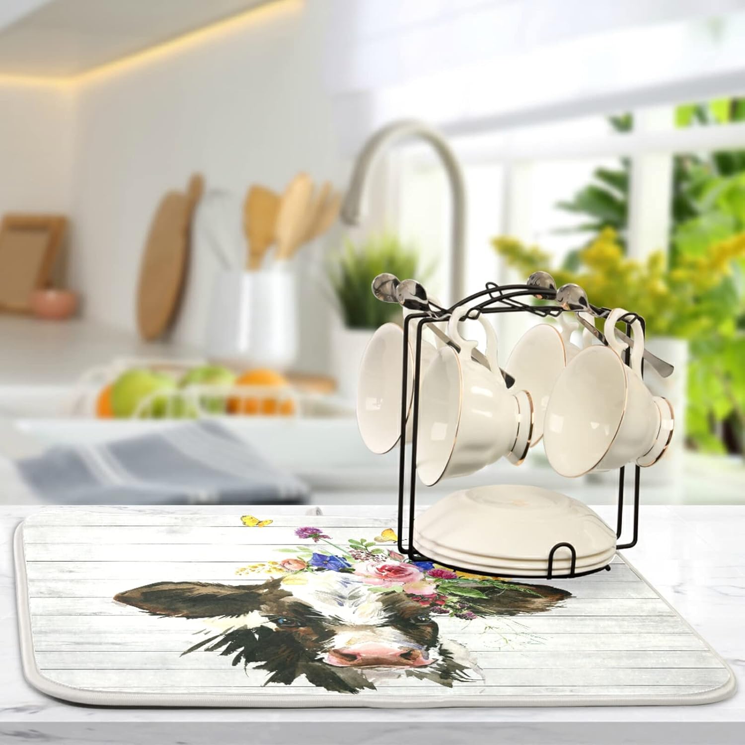 Farmhouse Cow Wood Dish Drying Mat for Kitchen 18x24 inch - Absorbent Microfiber Drainer Rack Fast Dry for Kitchen Counter