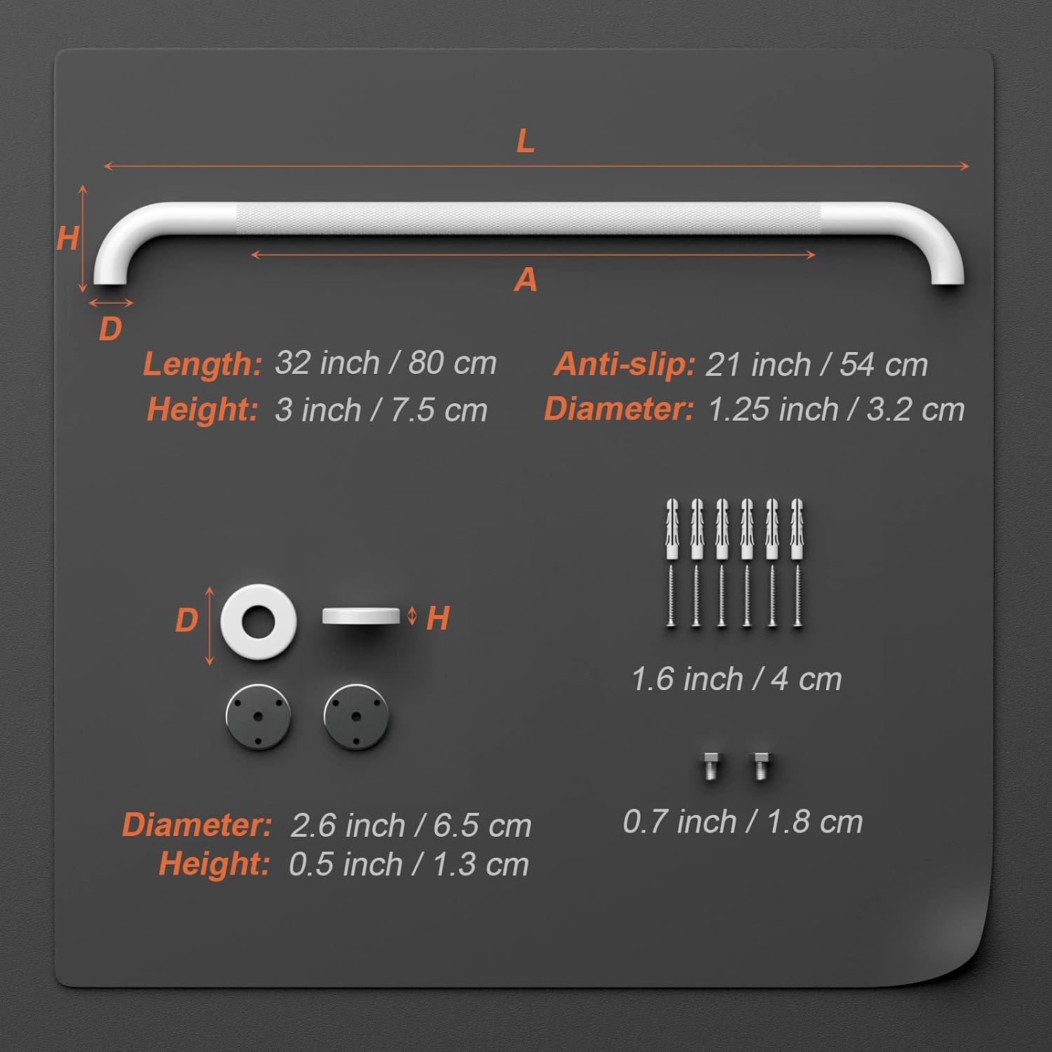 - Made of stainless steel with textured anti-slip grip for a lasting strength and quality. Able to support up to 500 lbs of pull force to provide a stable, reliable handhold; Total length is 32 inch (800 mm); 1.25 inch (32 mm) outer diameter; 32 gauge (32 mm) stainless steel tube; 6 rust-proof screws included(for each bar); 3-hole flange design used for stud mounting.