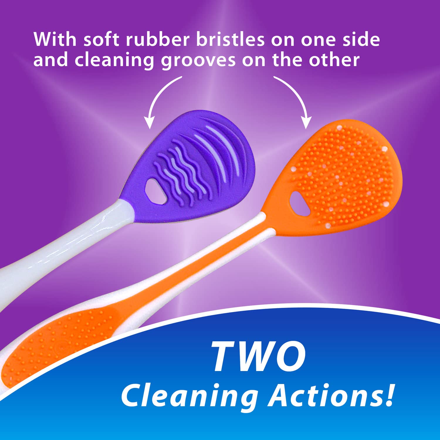 - 2οΈβ£ DUAL CLEANING ACTIONS: the tongue cleaner has both soft rubber bristles that help clean the tongue and cheeks and separate soft rubber cleaning grooves to clean away build-up.
