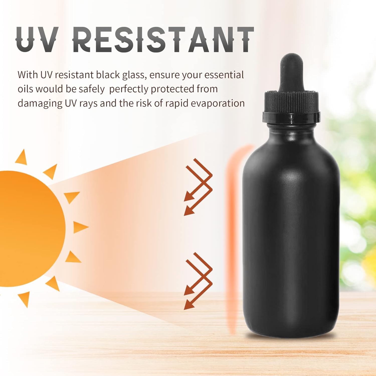 - 【UV RESISTANT】The frosted black dropper bottle is made of UV resistant amber glass, BPA and lead free, blocks light and prevents the oxidation of essential oils, ensuring your essential oils and perfumes are safe and perfectly protected from harmful UV rays and the risk of rapid evaporation.