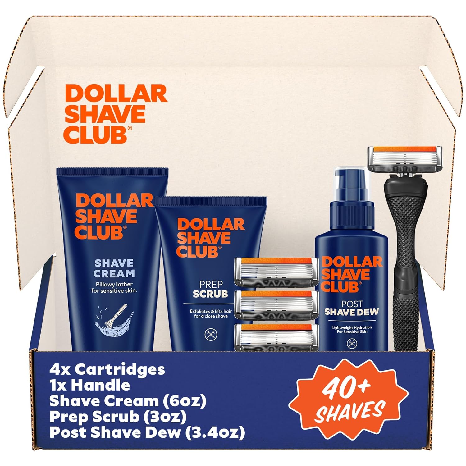 - What's included: 4 pack of 6 Blade Razor Refills, Handle, Prep Scrub 3 ounce, Shave Cream 6 ounce, Post Shave Dew 3.4 ounce