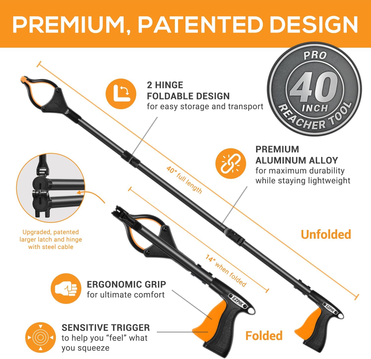 - Foldable Grabber Reacher Tool: The Ezpik Folding Grabbers Heavy Duty Tool is a Highly Portable, Folding Long Hand Grabber to a Compact 16 Inches - Making it a Convenient Companion Anywhere You Go.