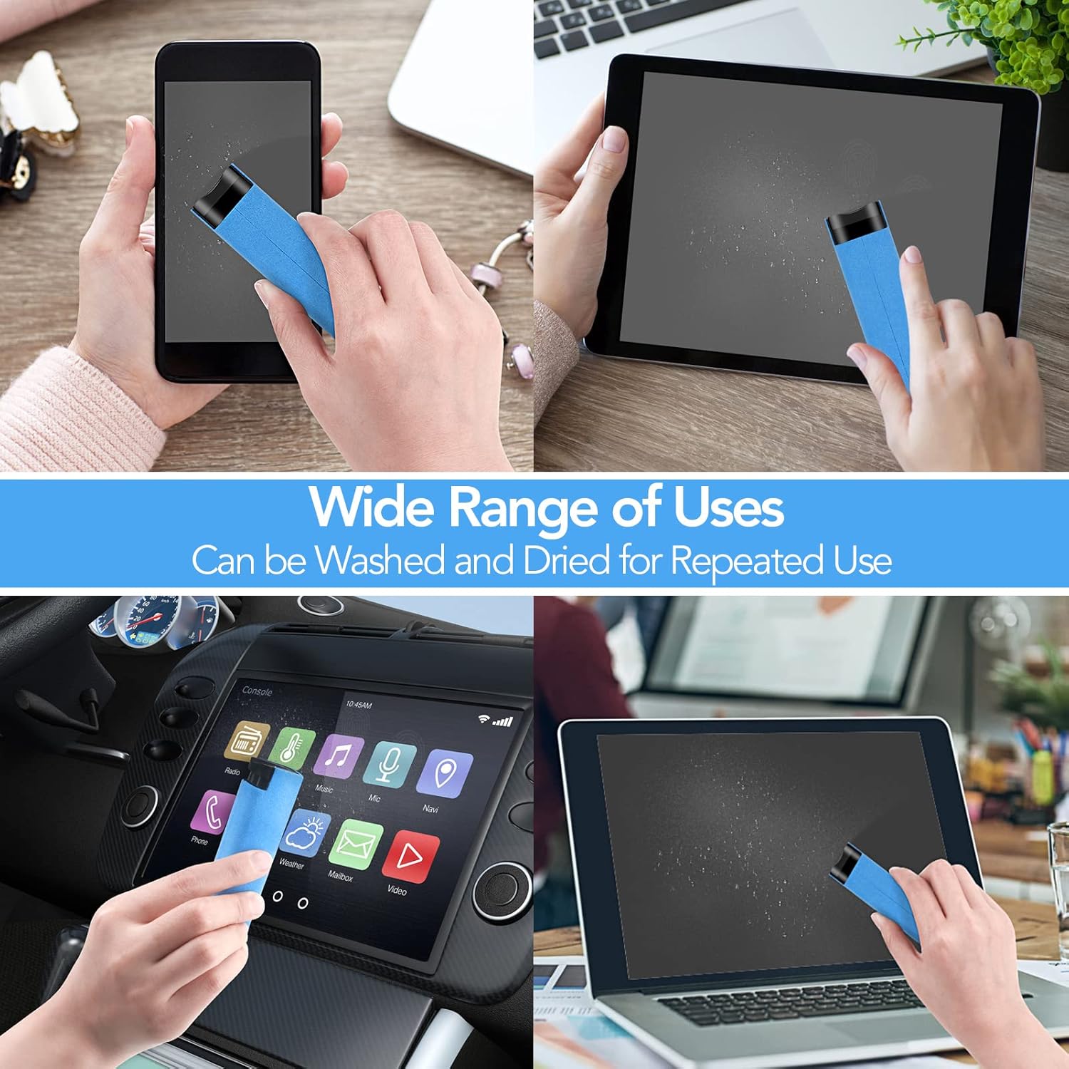 - Wide use: using for all Phones/Glasses/Pad/Car/LCD/LED/Laptop/Indicator/TV/Watch screen etc. Fingerprint-proof Screen Cleaner can be washed and dried for repeated use.