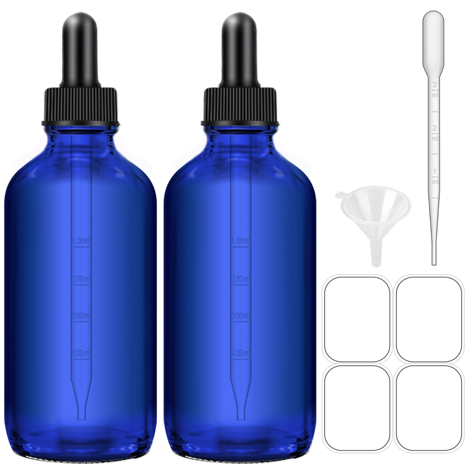 Bumobum Dropper Bottles, 4oz Blue Bottle with Dropper for Essential Oils with Funnel, Labels & Pipette, 2-Pack Tincture Bottles with Dropper(Unbreakable Plastic Eye Dropper)