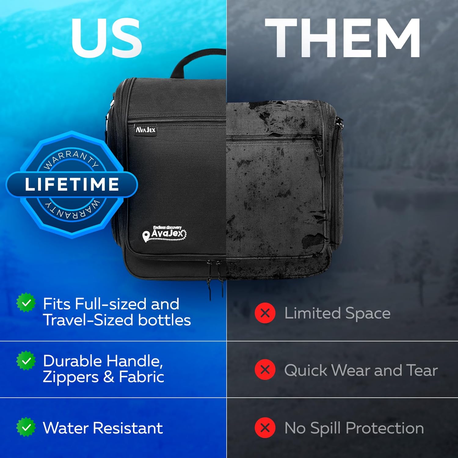 - ☔ VERSATILE TRAVEL BAG FOR TOILETRIES: Compact, lightweight and made of premium polyester with no smell and an easy to clean lining, this large toiletry bag is a keeper! Plus, it will save you the mess of spilled liquids on your clothes in your luggage, thanks to its 100% waterproof inner lining! guaranteed.