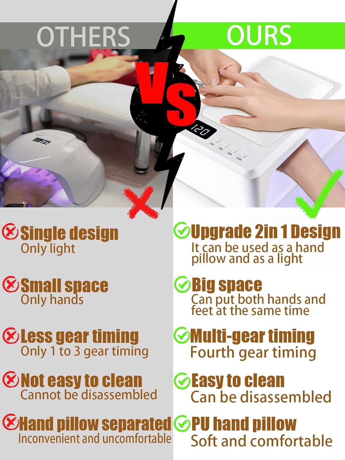 - 【Large U V Nail Lamp】Nail arm rest pillow + U V Nail Light 2 in 1 design. Large inner space for gel nail polish press on nails curing dry. It can curing 6-7 nail stand at the same time, improving the efficiency of your handmade press ons nails.