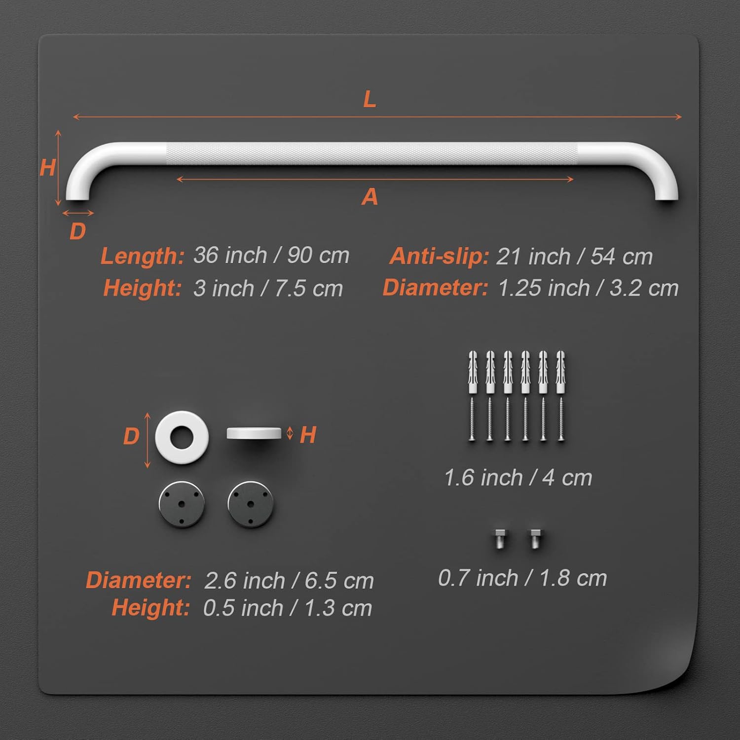 - Made of stainless steel with textured anti-slip grip for a lasting strength and quality. Able to support up to 500 lbs of pull force to provide a stable, reliable handhold; Total length is 36 inch (900 mm); 1.25 inch (32 mm) outer diameter; 32 gauge (32 mm) stainless steel tube; 6 rust-proof screws included(for each bar); 3-hole flange design used for stud mounting.