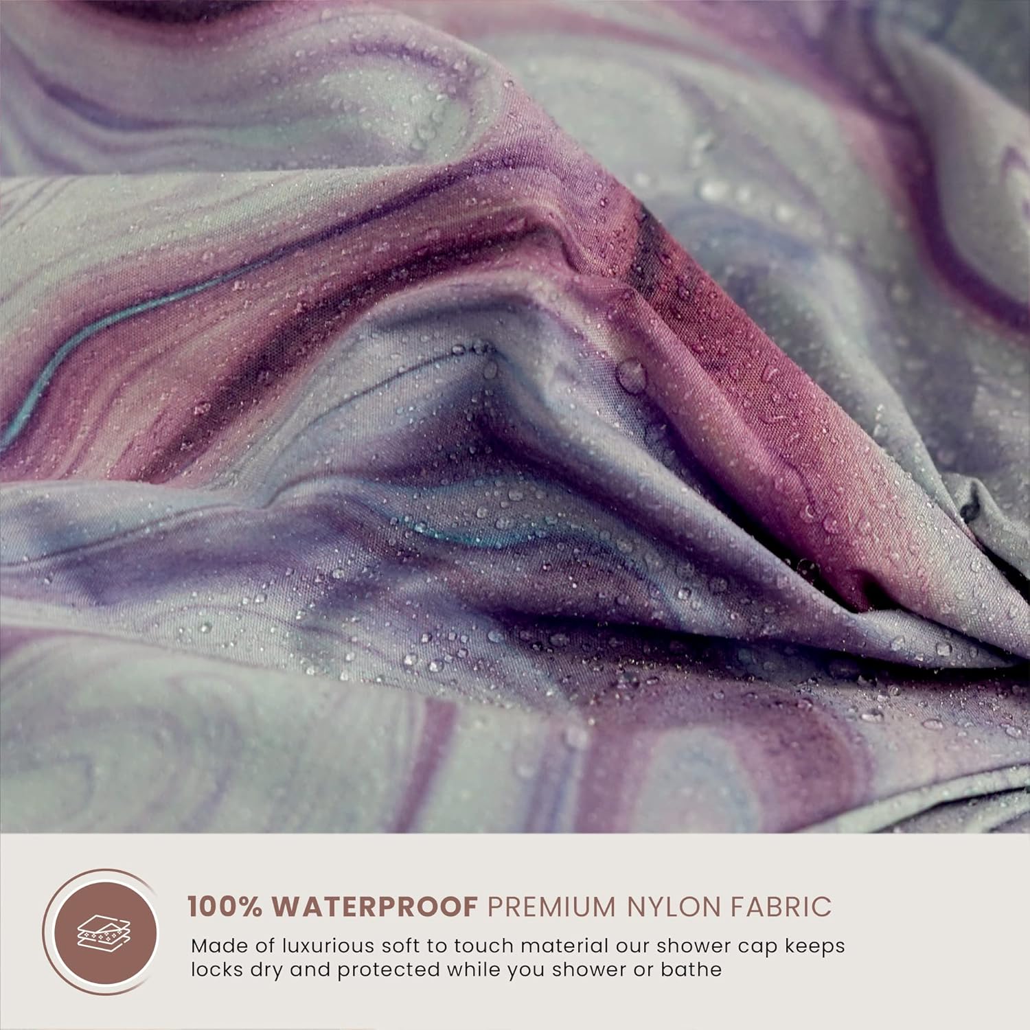 - THE AVERAGE SHOWER HAIR CAP is poorly made with flimsy materials, FALLING APART after a few uses. Crafted out of DURABLE, 100% waterproof polyester with a LIGHTWEIGHT, BREATHABLE feel, our washable shower cap is SOFT TO THE TOUCH and resistant to wrinkling & tearing. So you can count on it for LONG-LASTING PROTECTION against moisture – and say buh-bye to the WASTEFUL CYCLE of plastic hair caps.