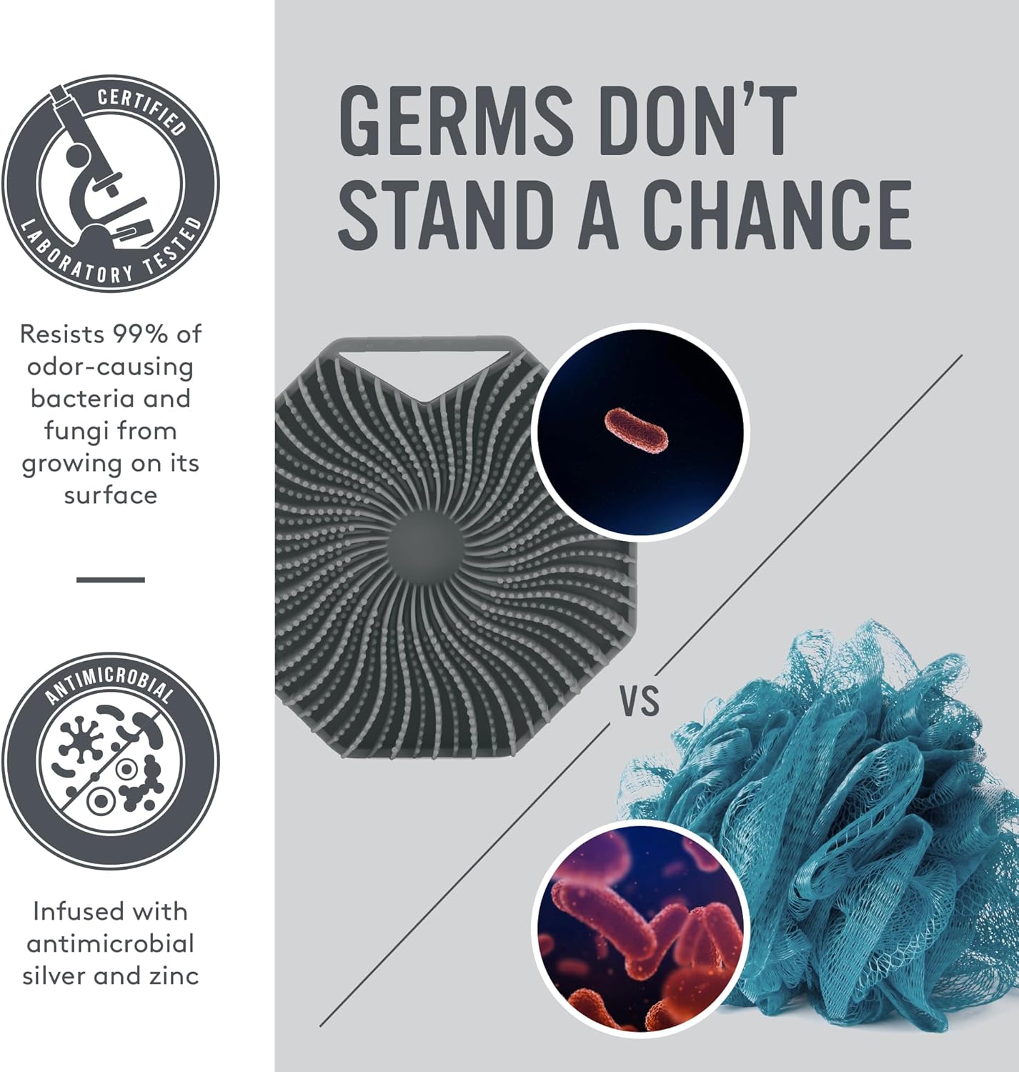 - ANTIMICROBIAL - Compared to cheap silicone scrubbers that claim to be hygienic, Sud Scrub is the only silver and zinc-infused silicone shower brush that is proven to resist 99% of odor-causing bacteria and fungi from growing on its surface.