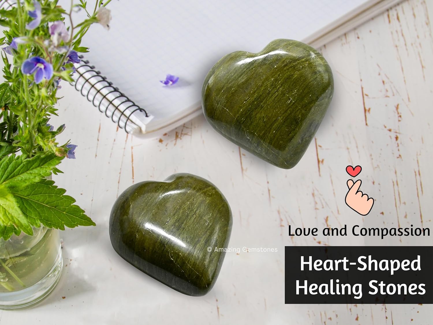 Vesuvianite Crystal Heart Palm Stone - Pocket Massage Worry Stone for Natural Body Chakra Balancing, Reiki Healing and Crystal Grid