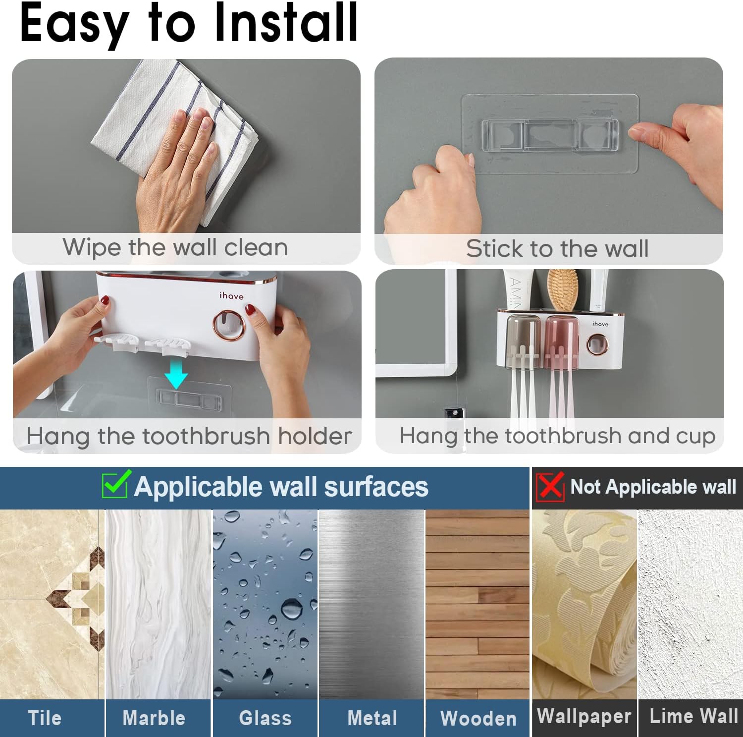 - Easy to Install: No holes and no drill. Wall mount installation does not hurt the wall. Just clean the wall and press the adhesive strip to bond the wall for 24 hours entirely, then you can hang the tooth brushing holder.