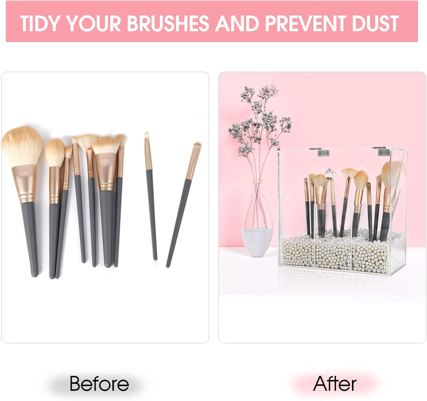 Acrylic Makeup Brush Holder, Clear Cosmetic Storage Box with 3 Brush Holders, Dust Cover, Large-Capacity Split Design for Organizing Vanity Desk