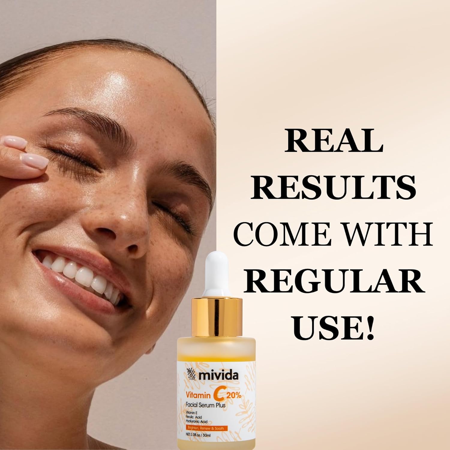 mivida 20% Vitamin C Serum for Face, Anti-Aging & Brightening Serum | W/Hyaluronic & Ferulic Acid, Vit E | Reduces Wrinkles, Fine Lines, Dark Spots & Hyperpigmentation, Maximum Strength Formula, 1floz