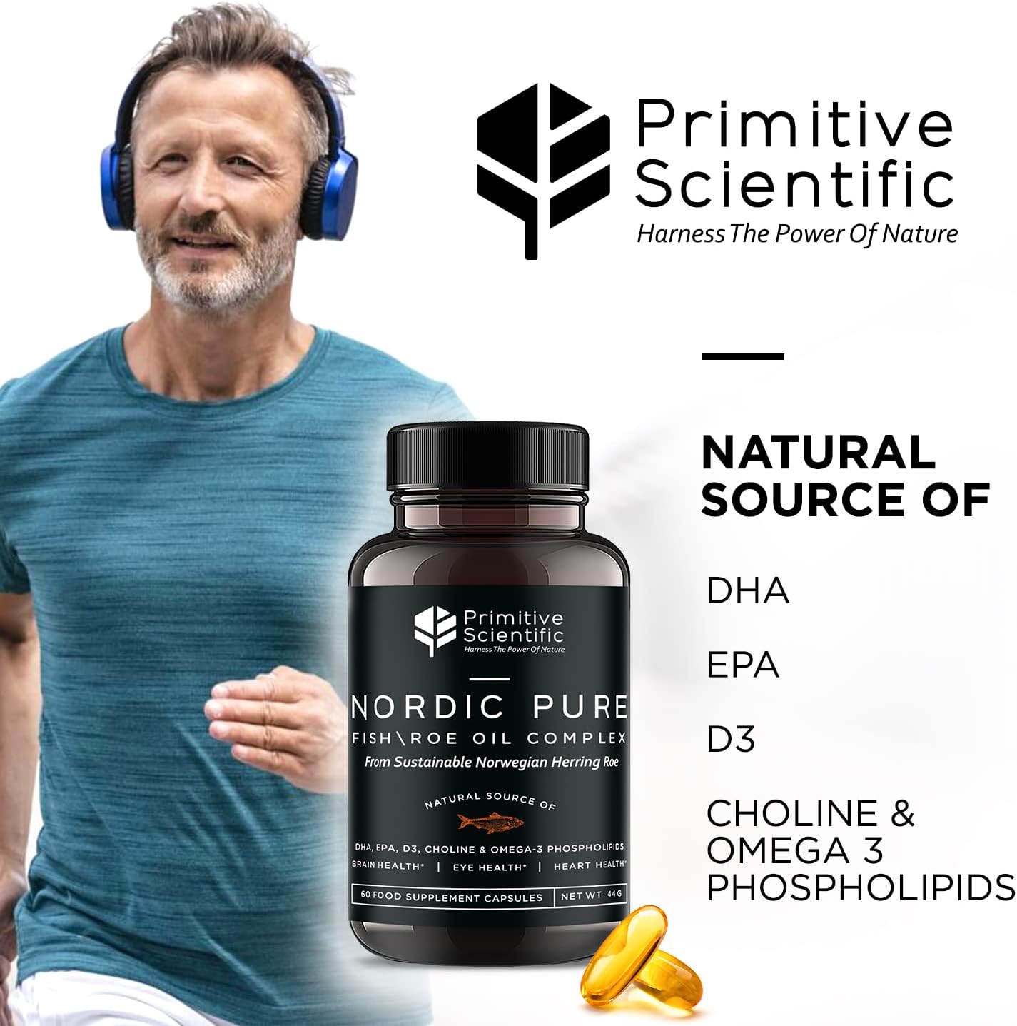- Omega-3 Fish & Krill Oil Benefits in One Capsule - Nordic Pure roe and fish oil pills have triglyceride forms with high EPA/DHA content from fish oil and high phospholipid content with choline from herring roe oil.