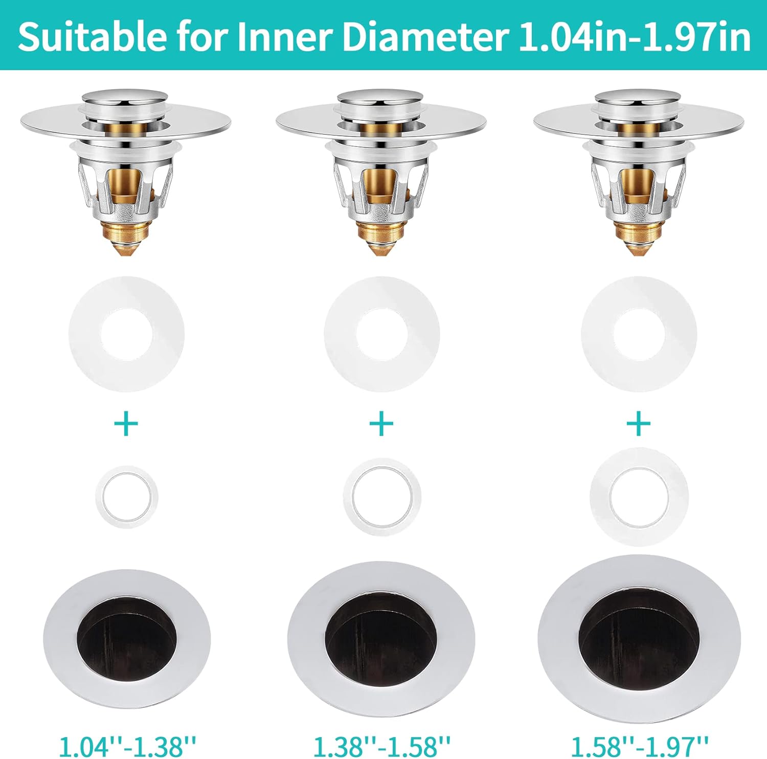 - [ Universal Size ] The bathroom sink stopper can be used for different types of basin drain. The inner diameter of sink stopper strainer is 1.04’’. Suitable for drain holes with an inner diameter of 1.04-1.97 inch.