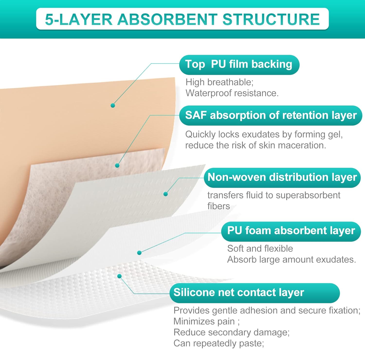 - PROMOTE HEALING LESS PAIN - Absorbs 15 times of wound exudate absorbs to our 5 layers material self-adherent wound dressings. It maintains a healthy moisture environment, creates a barrier from the outside, promotes wound healing