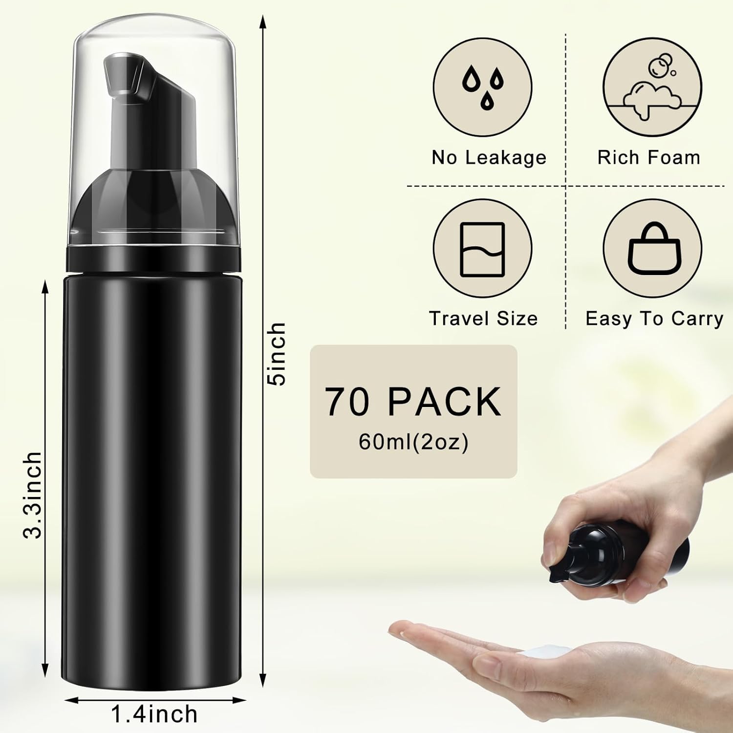 70 Pcs 2 oz Plastic Foam Soap Dispensers Refillable Lash Shampoo Bottles with Pump Mini Eyelash Cleaning Foam Bottle Dispenser for Refillable Travel Cosmetics (Black)
