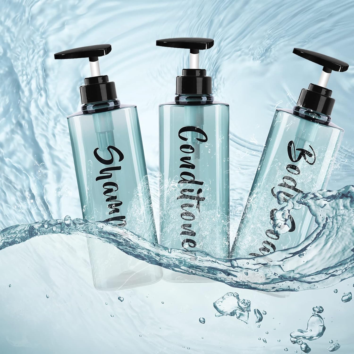 - 【High-Quality & Modern Design】 Upgrade your bathroom with AUMIO’s shampoo dispenser for shower! Made from extra-thick, crack-resistant PET plastic, these shampoo bottles are built to last. The clear blue square design adds a touch of elegance, while the silkscreened labels (Shampoo, Conditioner, Body Soap) ensure easy identification. Perfect for modern homes, hotels, or as a thoughtful gift!