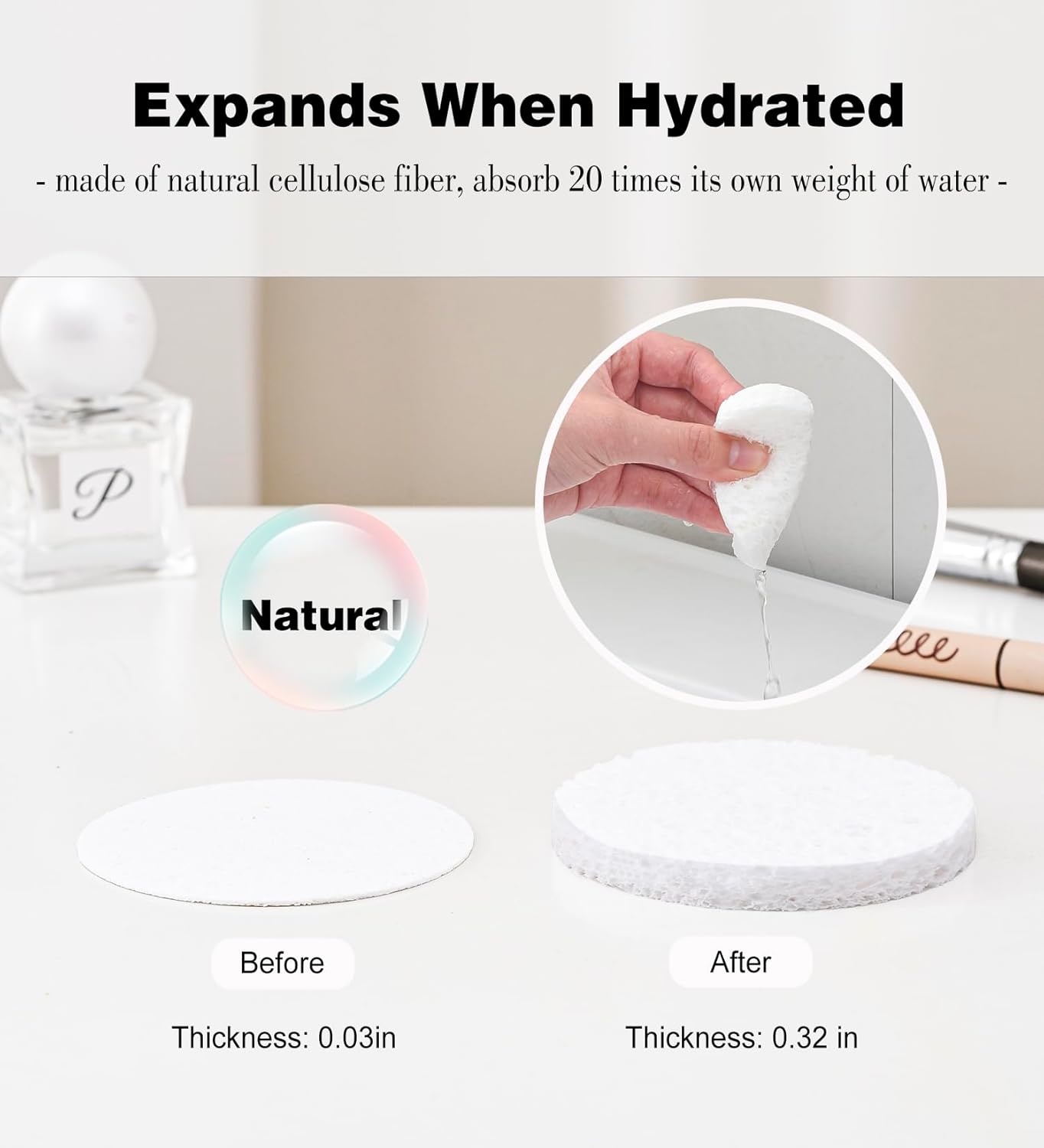- 【NATURAL & Safe】: Made of 100% natural sponge extracted from wood pulp, good absorbency.Tips: Absorb water and becomes soft to touch before use