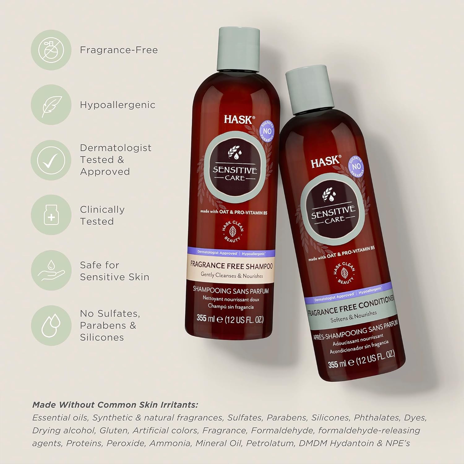 HASK Sensitive Care Shampoo + Conditioner Set | Fragrance-Free, Paraben-Free, Sulfate-Free, Gluten-Free, Vegan, Cruelty-Free, Color Safe | 12oz each