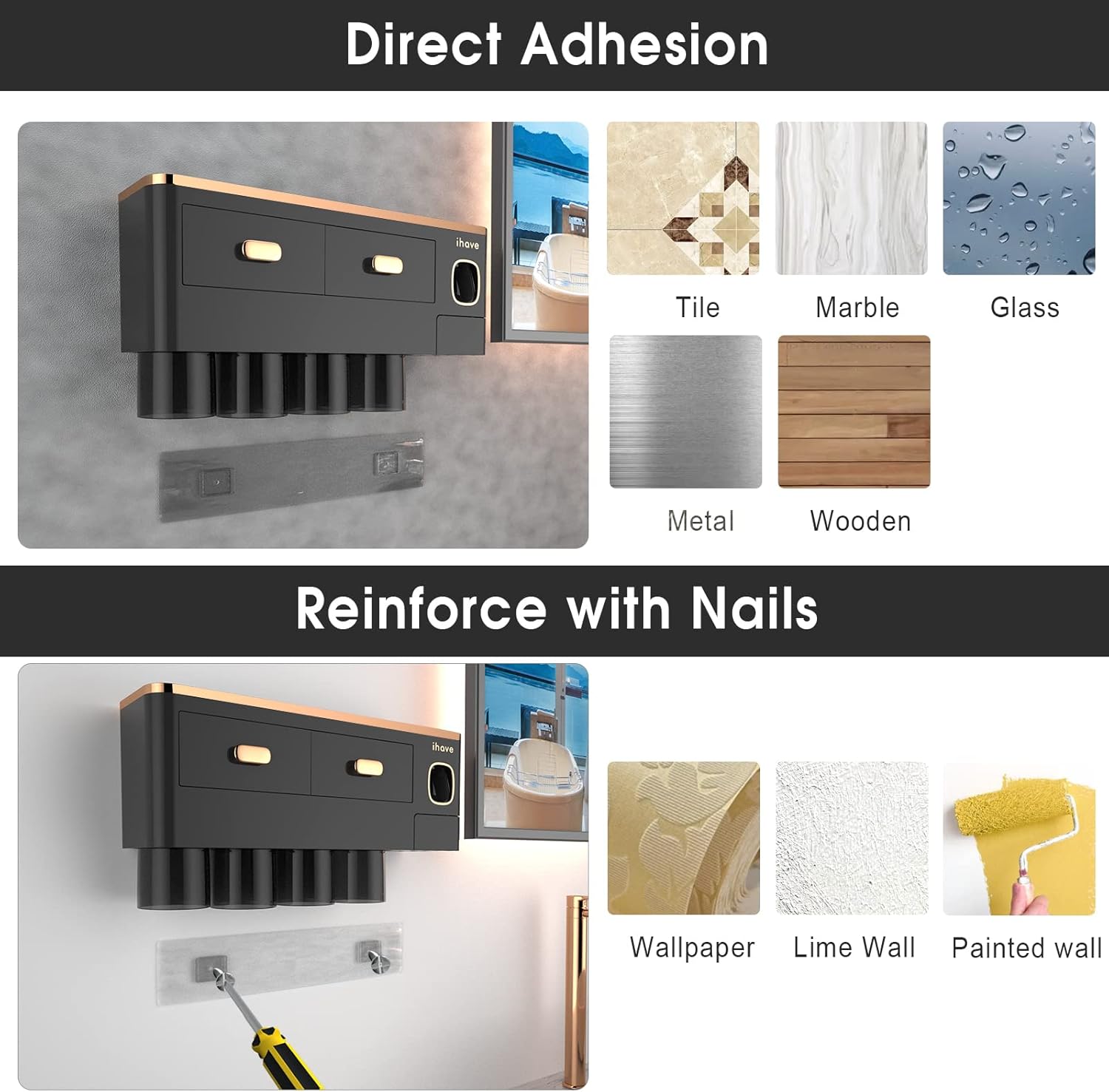- Easy to Install: Simplify your life with easy installation of iHave toothbrush holders - No drills or holes required! You can install it in a matter of minutes by cleaning the wall and pressing the adhesive strip to bond the wall for 2 hours entirely. After that, you can hang your tooth brushing holder, and it will stay firmly in place without any worries.