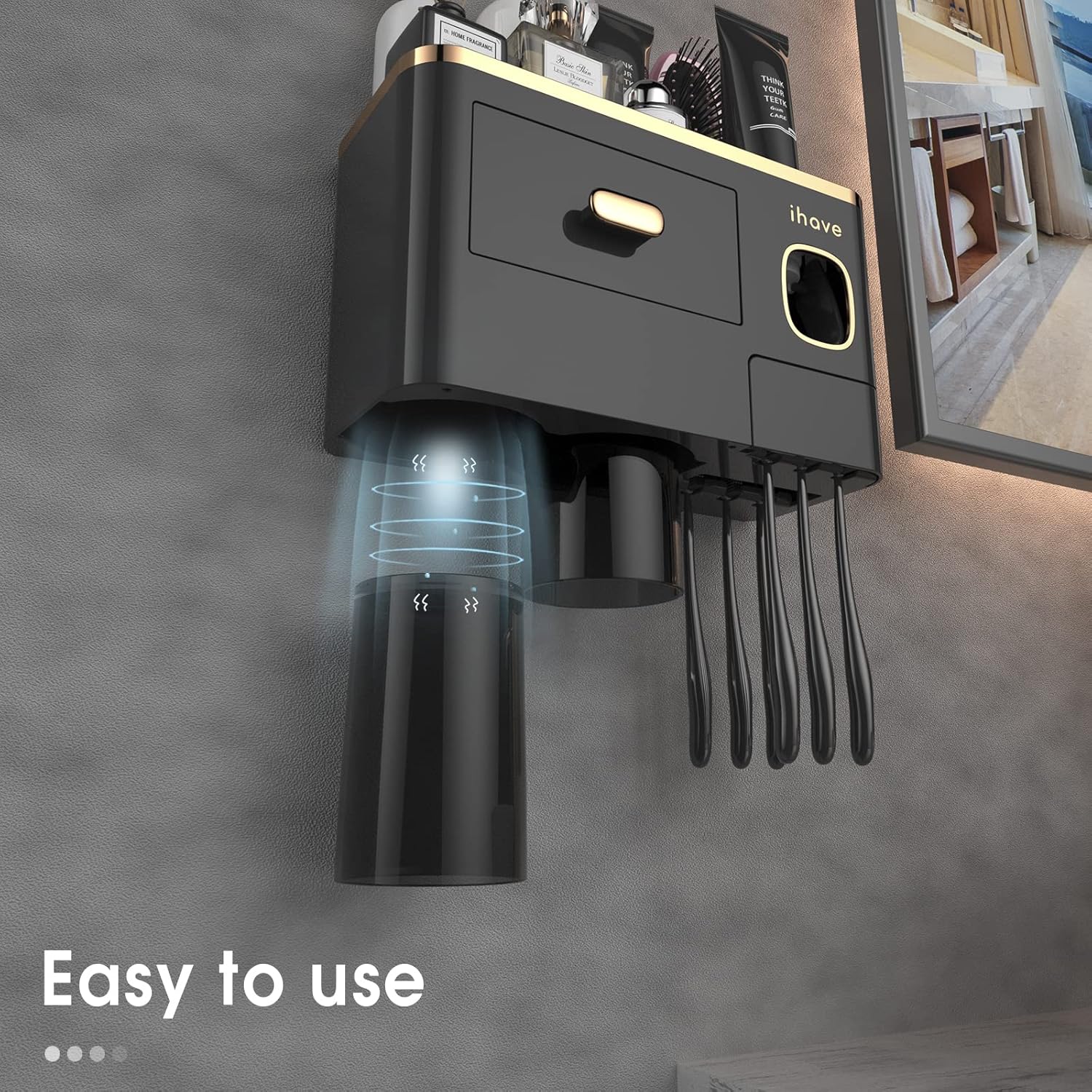 iHave Toothbrush Holders for Bathrooms - Upgrade Wall Mounted Toothbrush Holder with Toothpaste Dispenser - 2 Cups, Large Capacity Tray, Cosmetic Drawer - Bathroom Decor & Bathroom Accessories