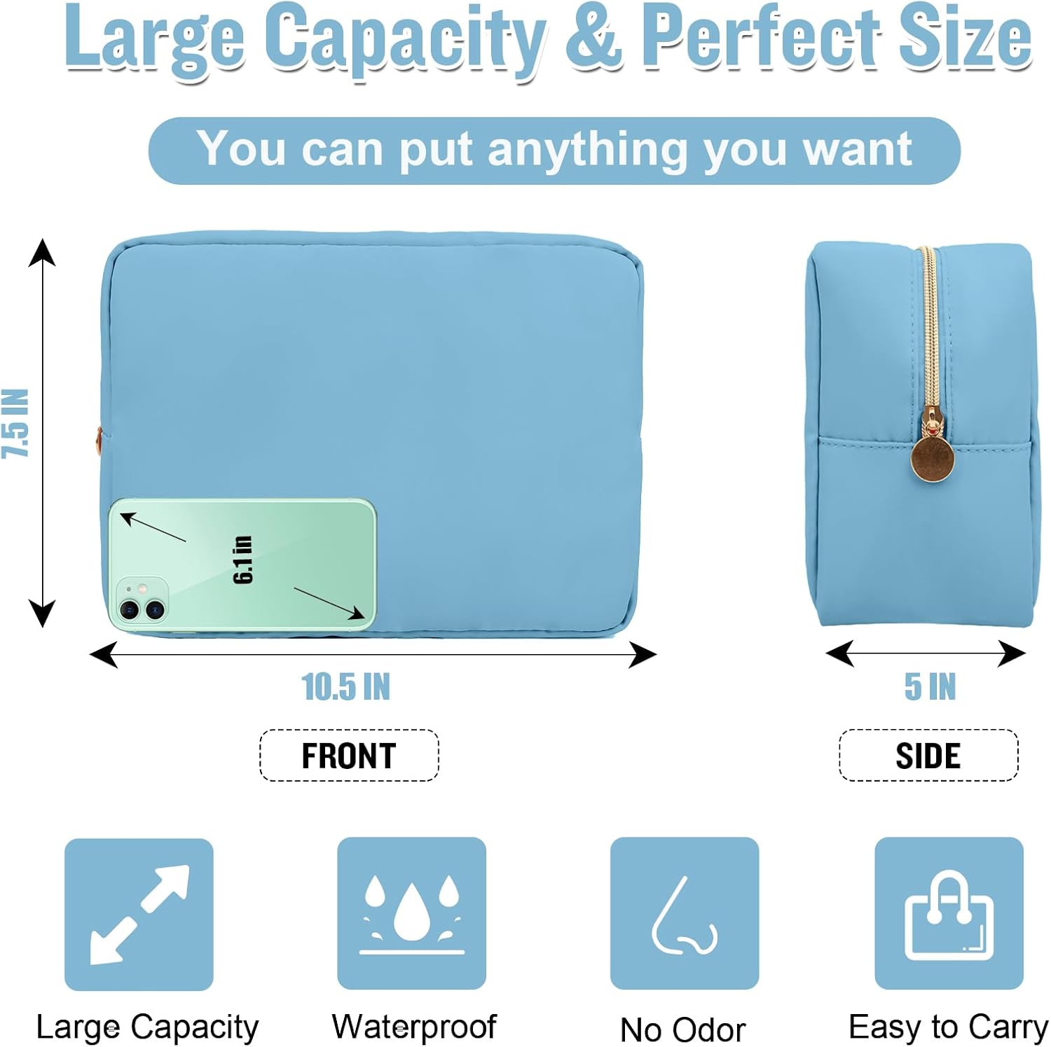 - ❤【Large Capacity & Perfect Size】Large Makeup Bag Size is 11*8*5inch/28*20*12.7cm, the large capacity storage bag can store all your cosmetics, snacks, phone, purse, sunglasses, travel essentials and anything you need. The easy and large opening design makes it easy to take. Keep your contents separate and organized.