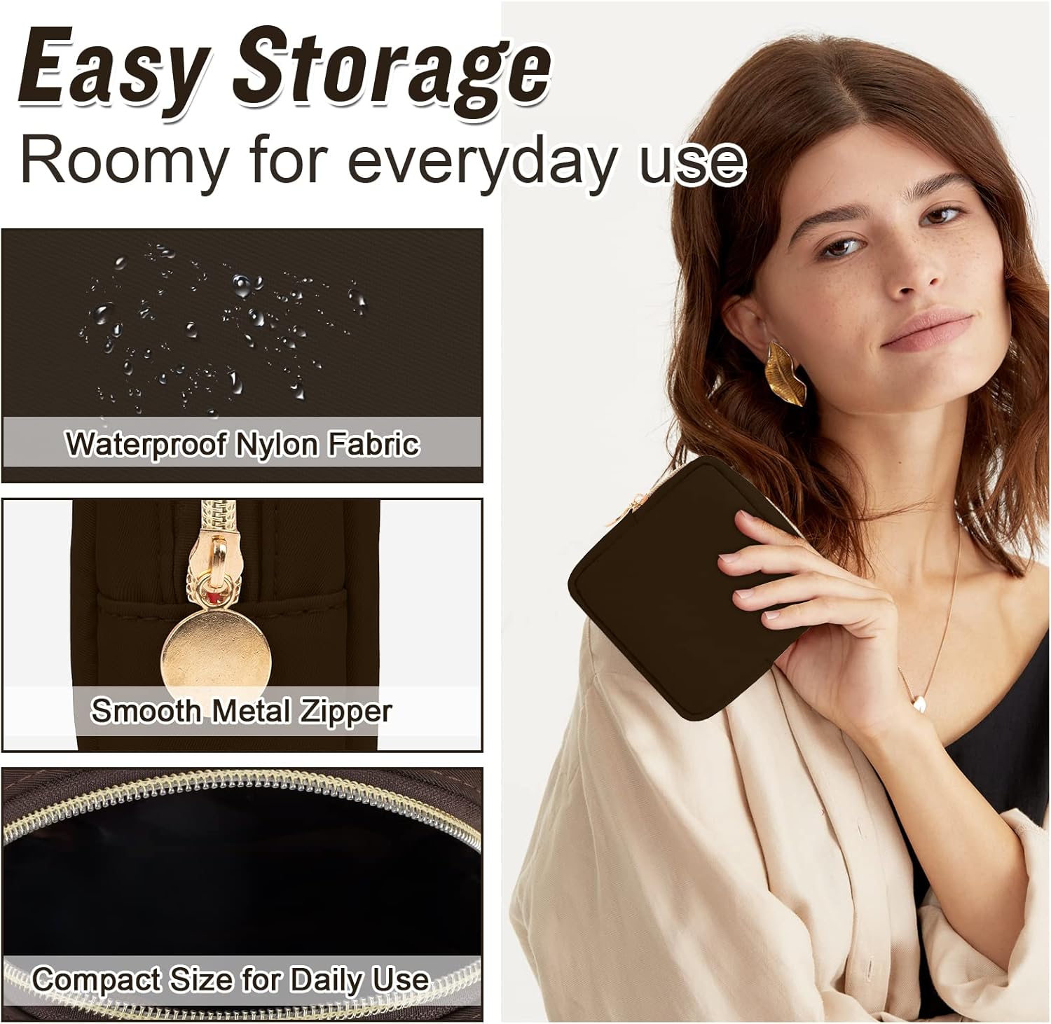 Nylon Mini Makeup Bag for Purse, Preppy Small Cute Makeup Bag Cosmetic Zipper Pouch Purse, Waterproof Travel Coin Pouch Sanitary Napkin Storage Bag Clutch Makeup Organizer Pouch for Women(Brown)