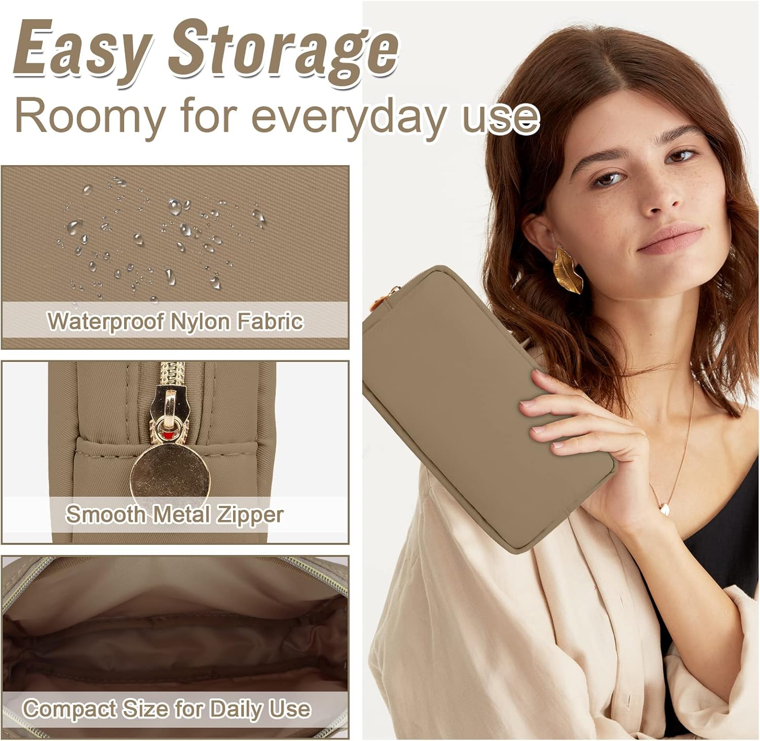 Nylon Small Makeup Bag for Purse, Preppy Cute Makeup Bag Cosmetic Zipper Pouch Purse, Waterproof Portable Travel Toiletry Bag Clutch Make Up Brush Bag Organizer Storage for Women Men Girls(Khaki)
