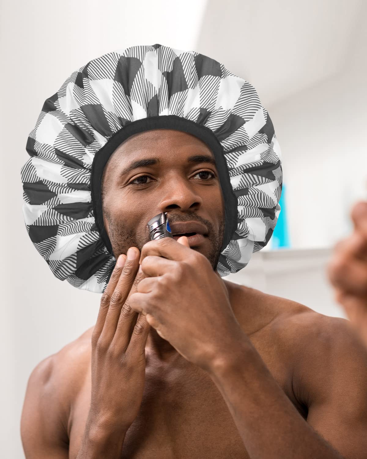 - 【COMFORTABLE FIT】Well-sewed elastic grip holds thick hair firmly, still comfortable to forehead. The soft elastic band of the shower cap will never irritate your head or neck