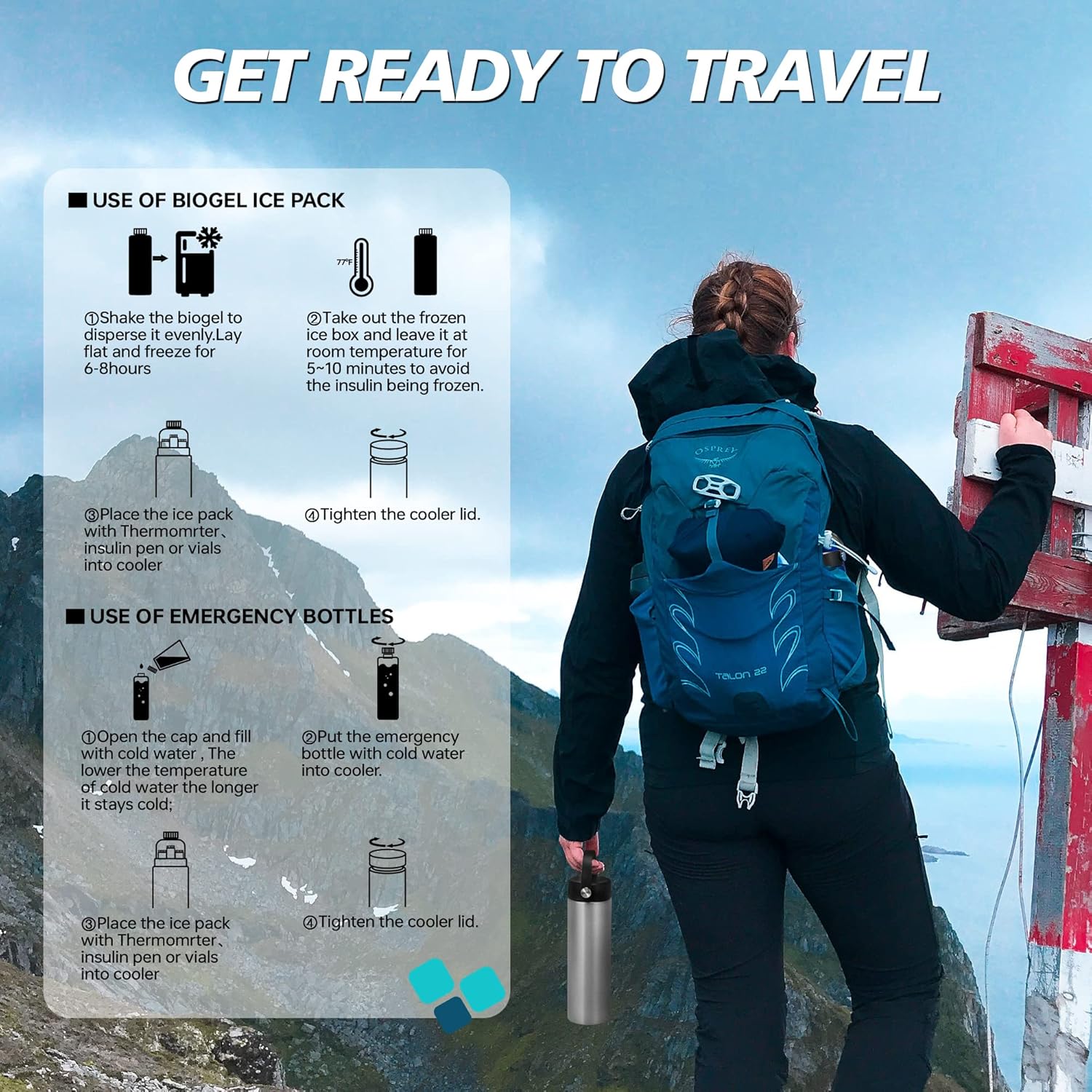 - 2 COOLING METHODS: 1) The blue ice pack with biogel provides 48 hours of cooling time; 2) The white ice water bottle adds an additional 12 hours of cooling time when filled with ice water; So you can travel without worrying about your medication expiring