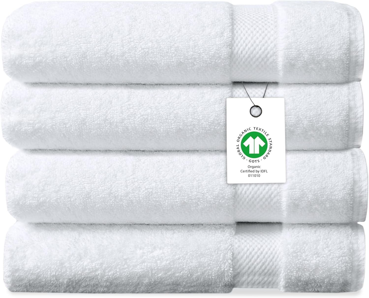 - TOWEL PACK OF 4: : This Organic Bath Towel Pack include 4 Piece Luxurious Plush Bath Towels (30"X58"). These towels are Constructed with 100% two-ply long-staple organic cotton terry cloth. So, no worry of loose fibers and pilling. Ultimate as a gift for somebody or as a treat for yourself! Raise your bathroom to a higher level with this luxurious Organic towel set.
