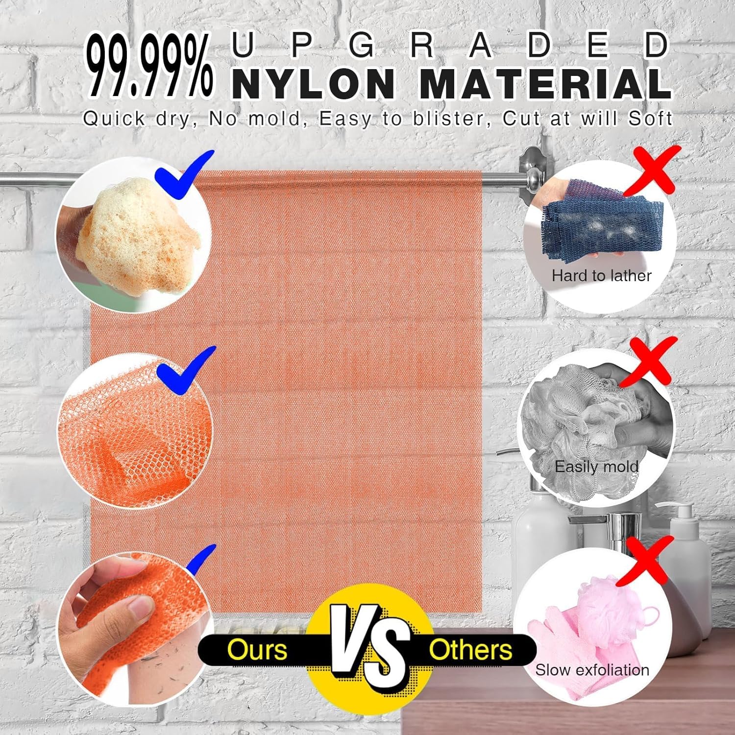 - 【More efficient cleaning】The exfoliating body net is rougher than a ordinary bathing cloth, but soft enough for daily body cleansing.easy for removing dead skin, dirt, oil, and eliminating impurities, unclogging pores, suitable for women and men of most ages to use.