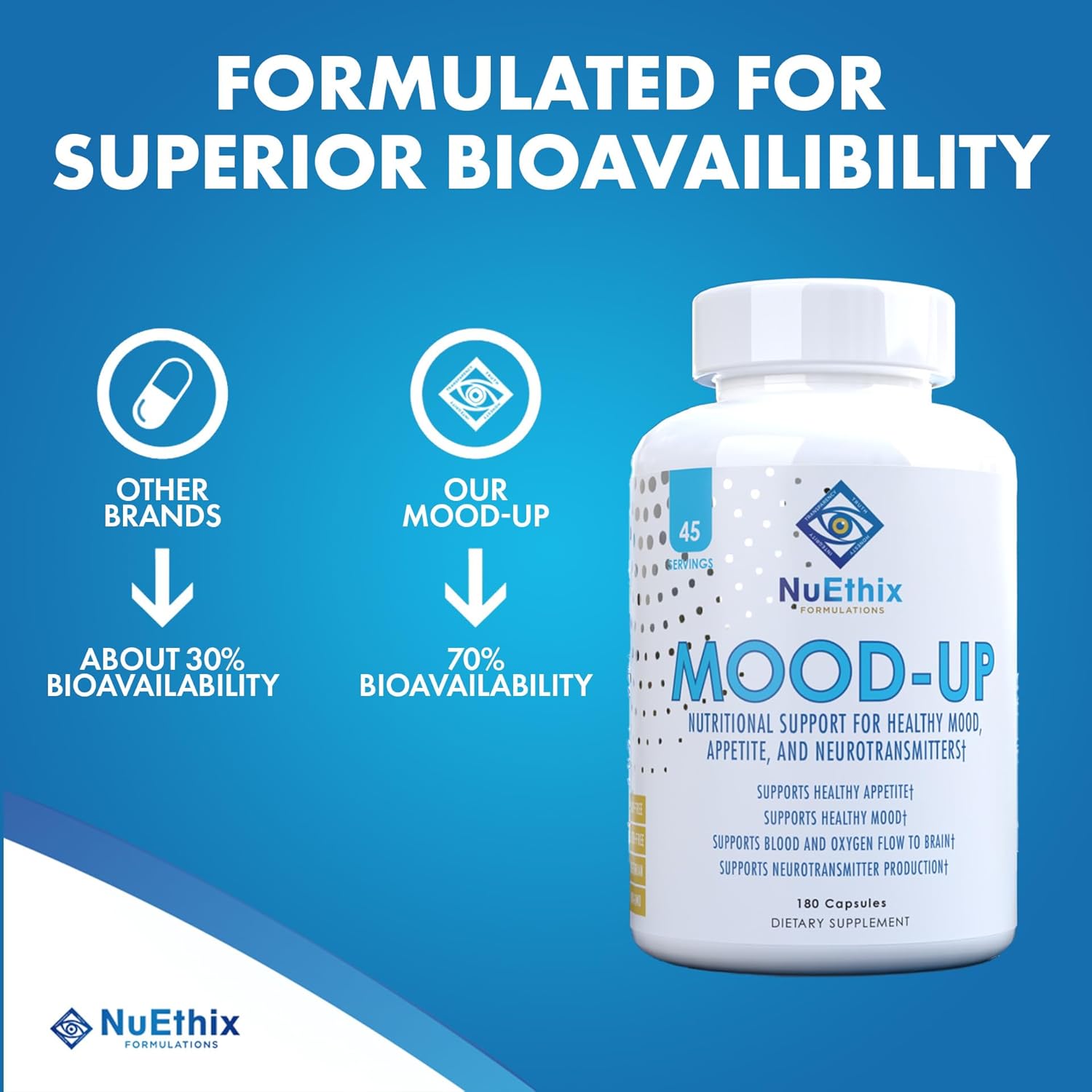 NuEthix Formulations Mood-Up - Stress Relief, Mood & Sleep Supplement - 5-HTP, Rhodiola Rosea + More - Natural Energy & Hormone Support - Non-GMO - 180 Capsules