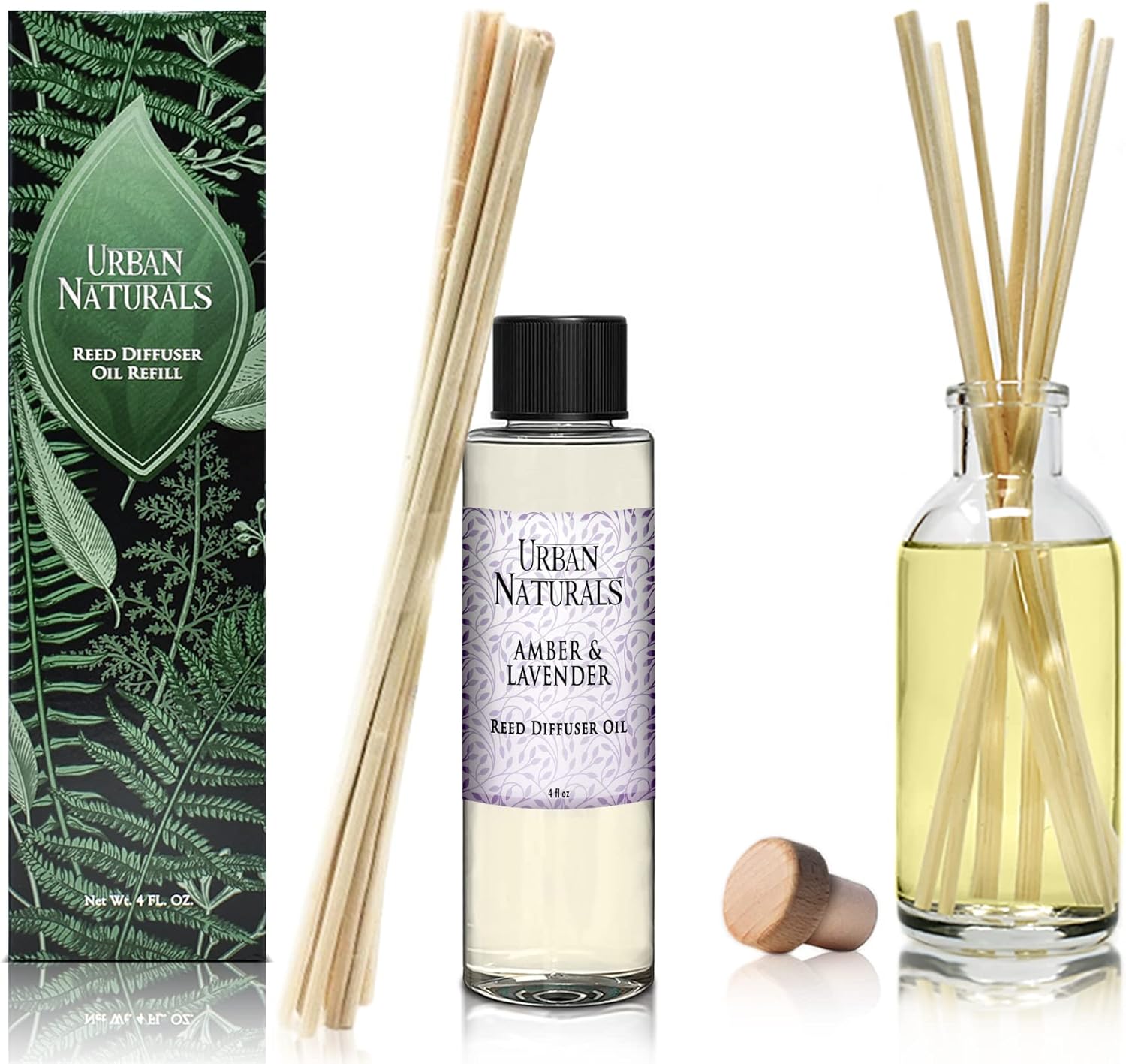 Urban Naturals Reed Diffuser Oil Refill Amber & Lavender, Soothing Lavender, Warm Amber, Calming Room Scent, 4 oz + Free Reed Sticks, Made in The USA