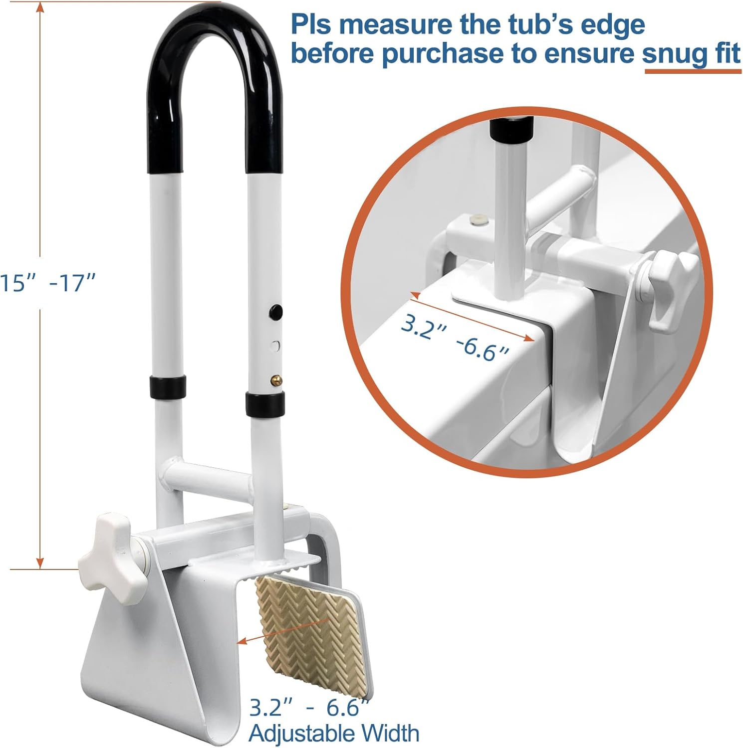 - Adjustable Width: Fits most standard tubs, adjustable from 3.3" to 6.7" with a secure locking mechanism. Portable and easy to relocate. Not suitable for fiberglass tubs.