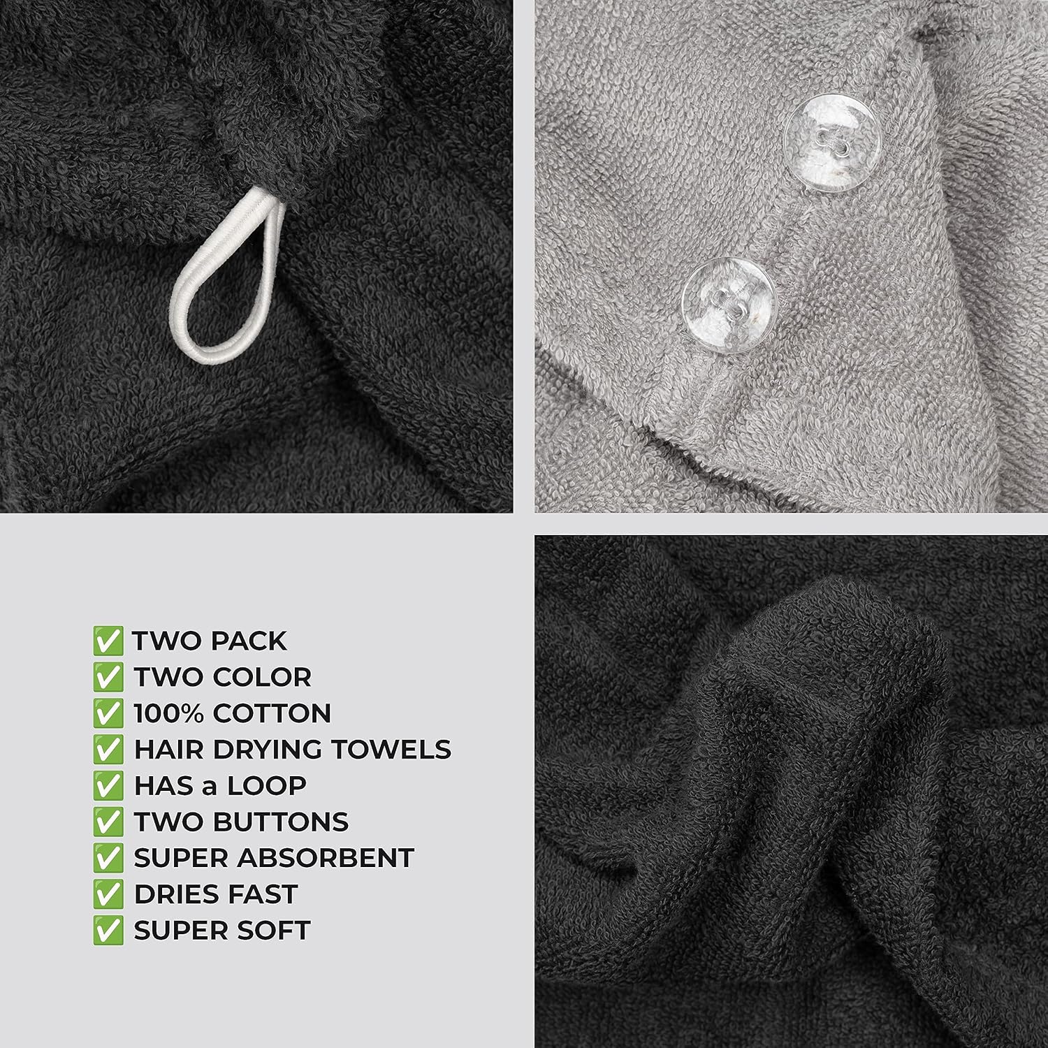 American Soft Linen 100% Cotton Hair Towels for Women, Head Towel Cap, Cotton Hair Turban Towel Wrap, Soft and Absorbent 2 Pack, Black-Light Gray